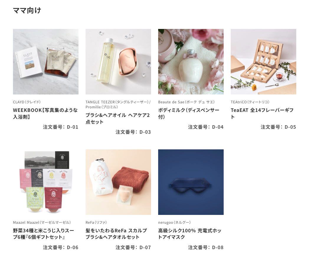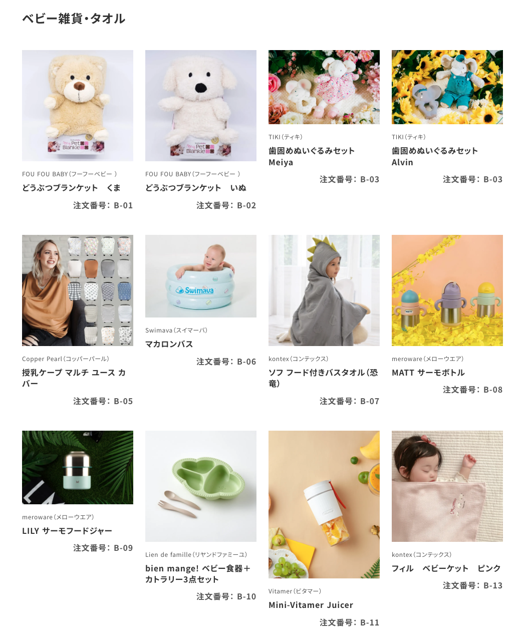 赤ちゃんが安心して使えるやさしい素材のベビーグッズや、 お母さんのためのケアアイテム、ご家族みんなで楽しめるグッズまで、 ギフト専門オンラインショップならではの幅広いラインナップをご用意いたしました。