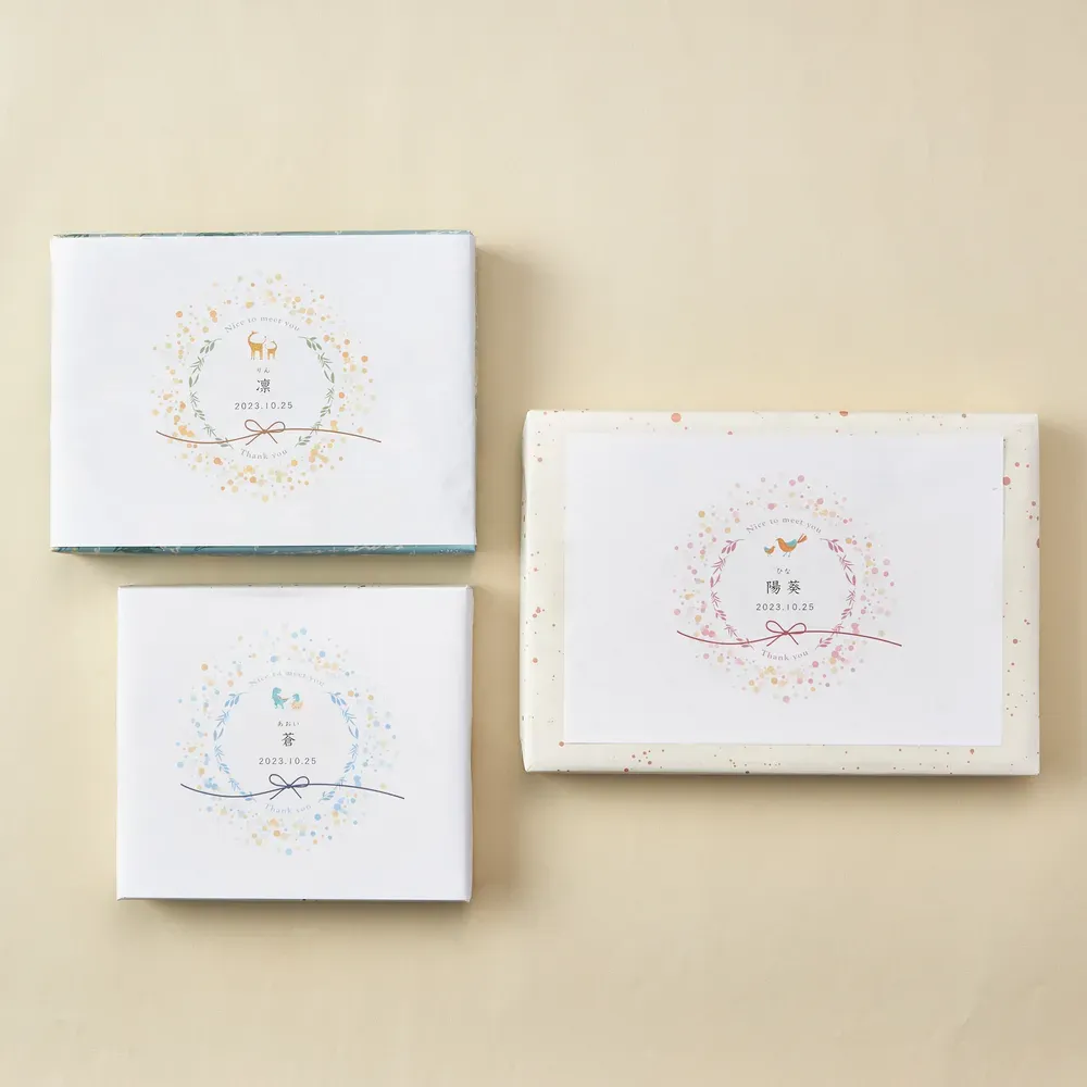 3種のイラストをご用意しております。 オプション選択画面にてご選択ください。(有料オプション) 名入れ(出産内祝い)と包装紙を併用していただくと画像のようにラッピングさせていただきます。 ※名入れ(出産内祝い)のみをご選択の場合は、商品をビニールの袋に入れた上から、名入れをお付けいたします。 ※画像は名入れイメージです。