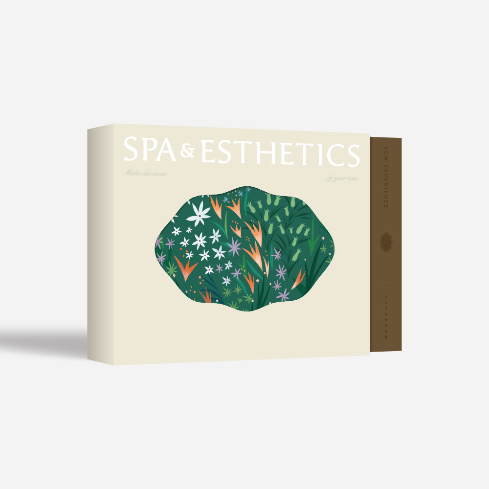 各サロンの特徴を紹介する冊子を同梱。心に染み入るやさしいデザインで、パッケージを開けた瞬間から癒やしの体験が始まります。