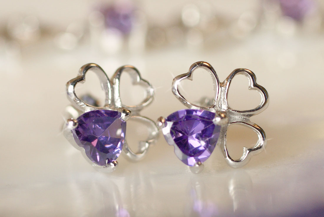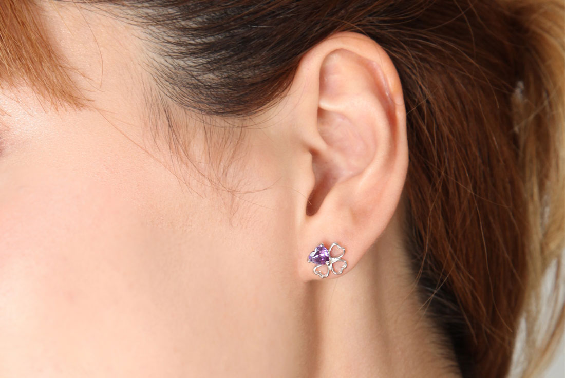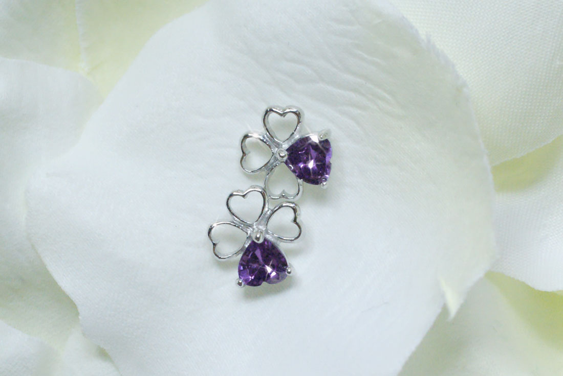 女性への贈り物に大人気の【クレメンティア・デコール】のアメジストクローバーピアス。ハートのアメジストがとても可愛いクローバーピアスです。ハート型のキュートで可愛らしいカットは、63面の多面カットで宝石の輝きを活かすため、透明度と反射率の高い宝石に良く使用されています。