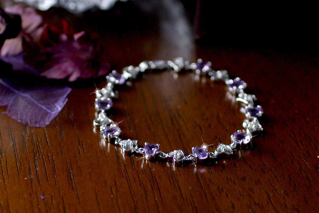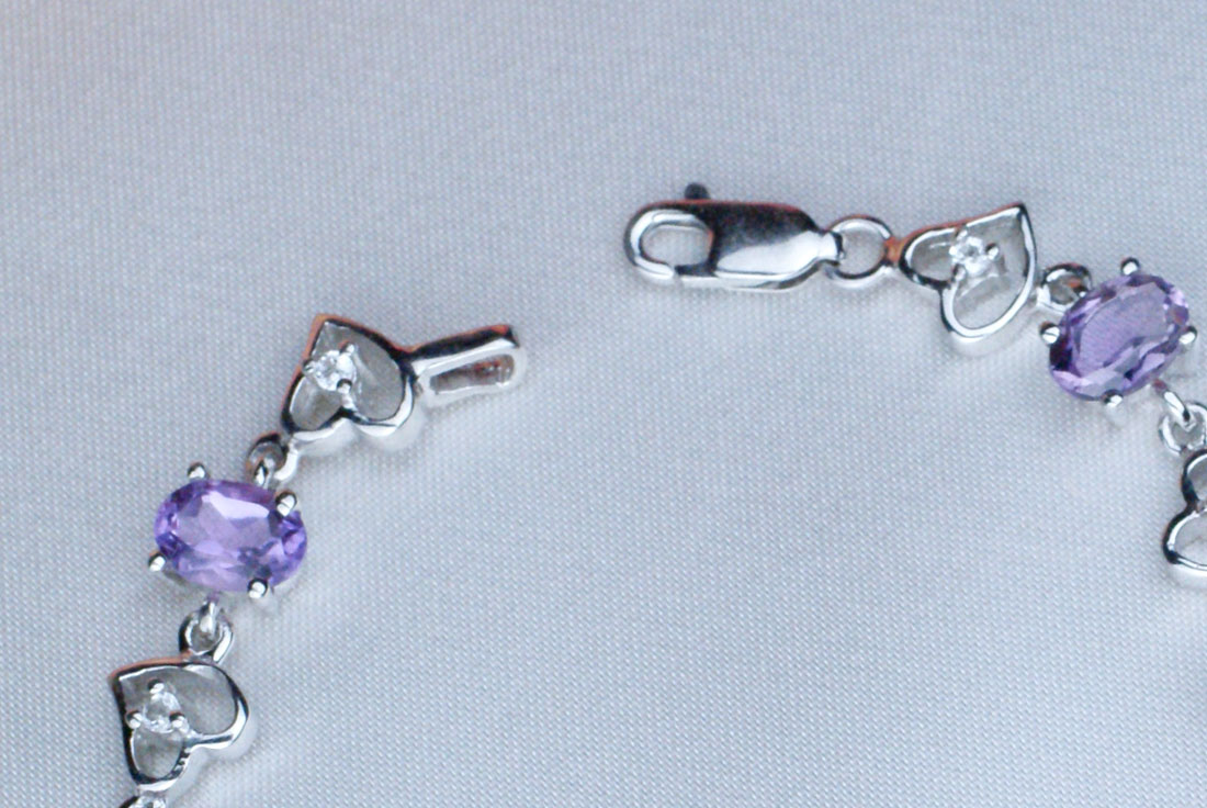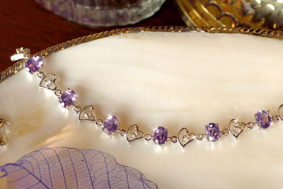 女性への贈り物に大人気の【クレメンティア・デコール】のアメジスト&トパーズブレスレット。ハートモチーフがとても可愛く、可憐なハートの間を彩るアメジストが女性の魅力を引き立たせます。簡単につけられる留め具になっているため、つけ外しも楽々です。