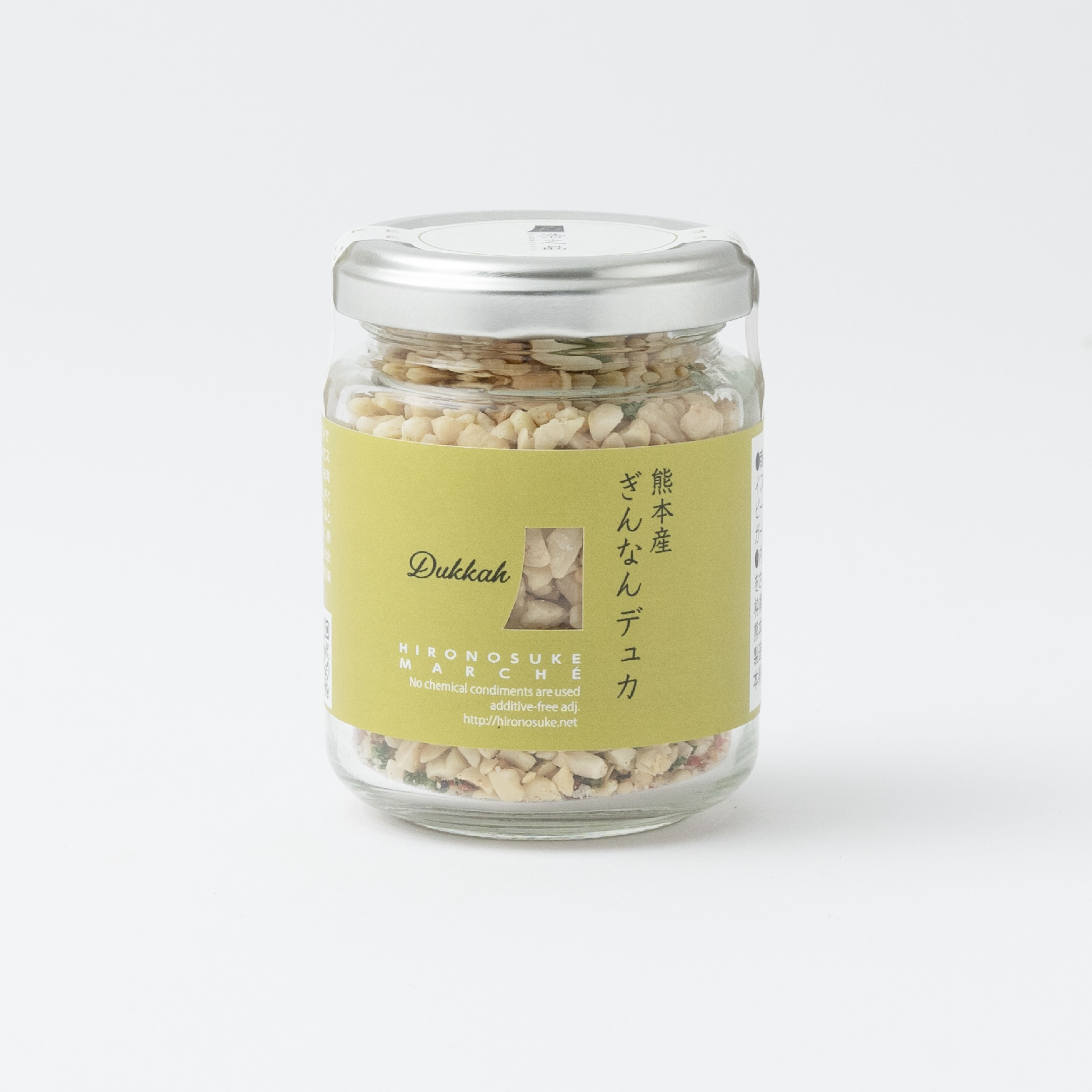 香ばしいぎんなんとナッツの新しい出会い。サクサク食感も楽しめる新感覚のナッツ&スパイスミックスです。 中東発祥の砕いたナッツとスパイスをミックスした「デュカ」を浩之勗オリジナルで創作。さまざまなナッツに熊本産銀杏と天草産塩を加え、料理のトッピングにおススメです。 香ばしさと食感とほのかなスパイス感が特徴。 【Barの味が広がる活用術】カレーや唐揚げ、サラダにパラパラかけて。オリーブオイルと混ぜてバゲットやサラダに。