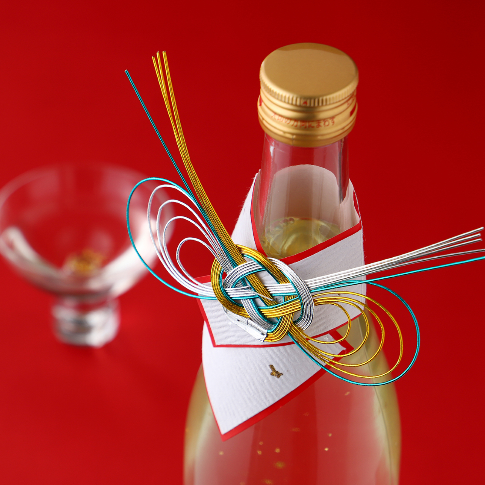ボトルの首には「人と人とを結びつける」という思いを込めて、贈答の場面でも使われる水引をかけました。 新年用のお酒として、結婚祝いや退職祝いなどのお祝いごとにもおすすめです。