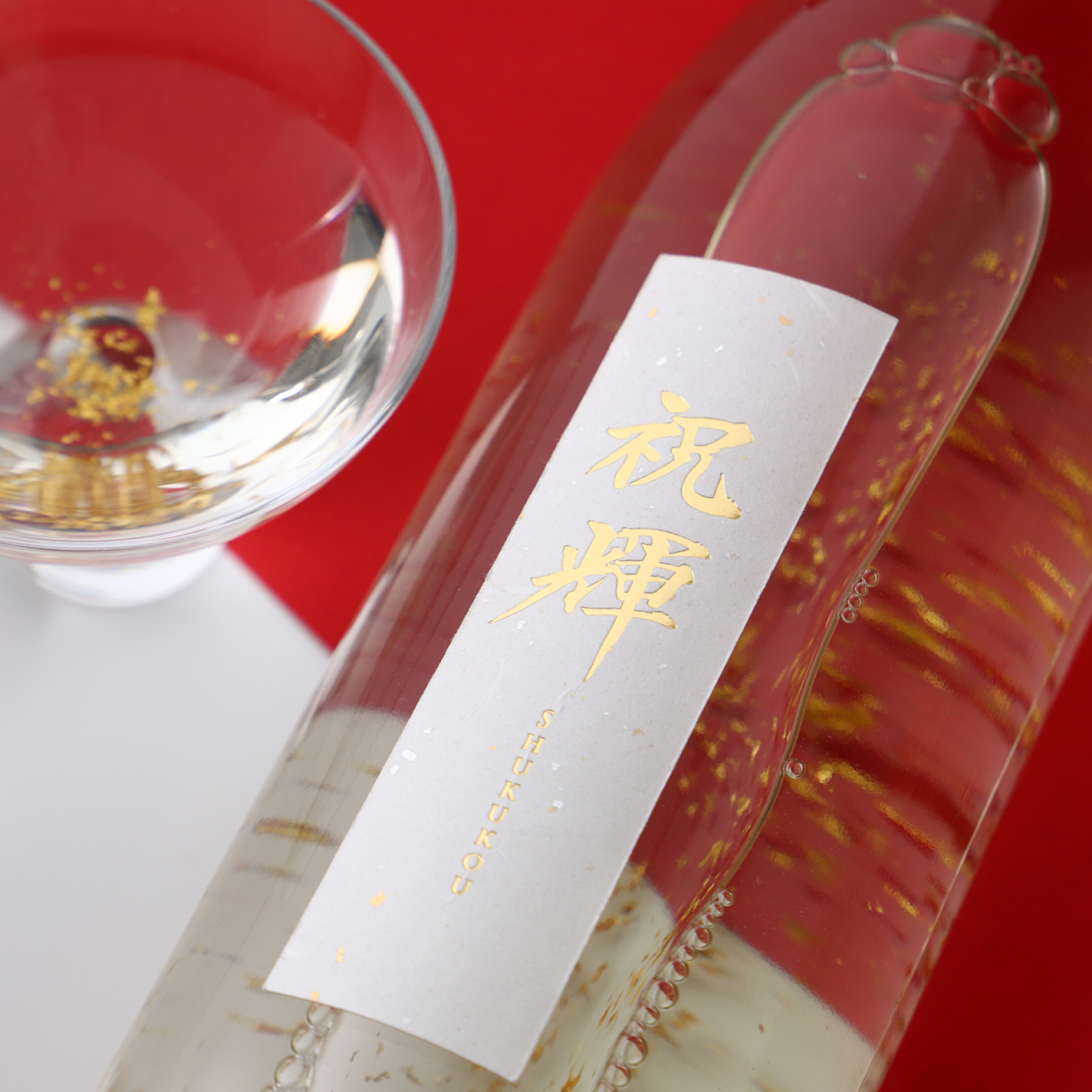 大口注文・法人のお問い合わせはこちら「祝輝 -Shukukou-」は、「大切な人への贈り物となる1本を」をテーマに開発した純米吟醸酒です。 日本酒の中に金箔を入れることで、淡い金色に光が反射し、まるで日本酒が輝いているかのような様子を生み出しました。グラスに注ぐと金箔がふわりと踊り出し、飲む人の笑顔をやさしく照らします。