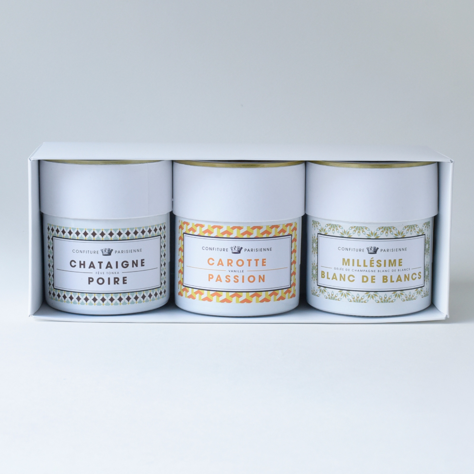 パリの人気ジャムメゾン「コンフィチュール パリジェンヌ」。銅鍋で丁寧に炊き上げた果実の香り豊かな3種を詰め合わせました。洗練されたデザインで季節の贈り物や手土産にもぴったりです。