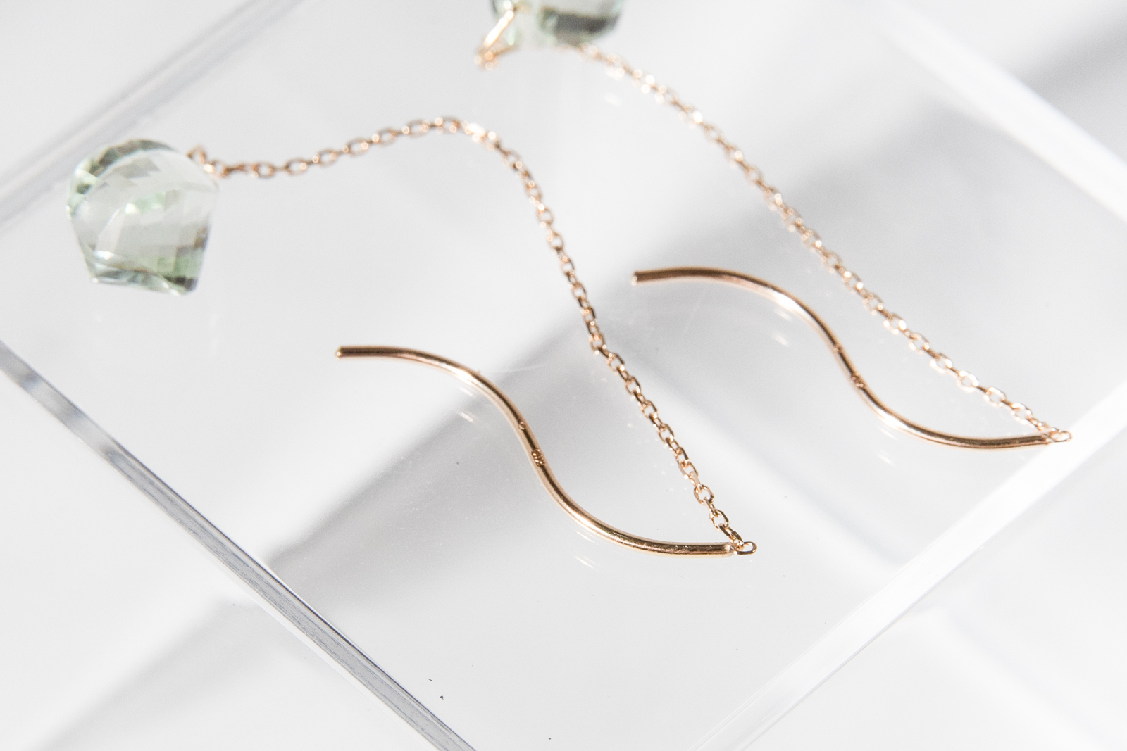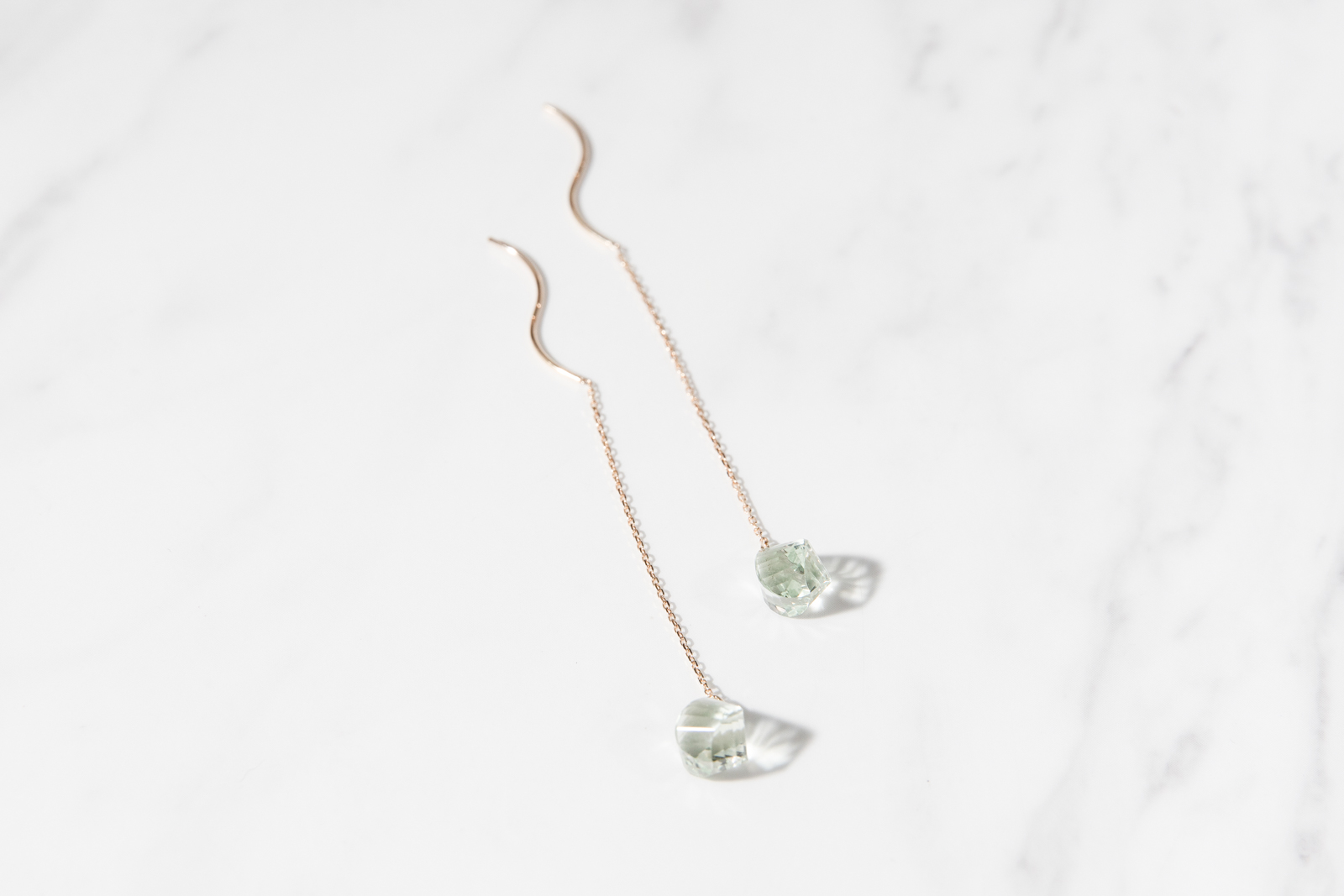 グリーンアメシストの抜け感のあるカラーはほどよい存在感で、コーディネイトのアクセントになります。またエンドパーツも少しひねりを加え、アメシストのカットと同じようにして、一体感を演出しています。