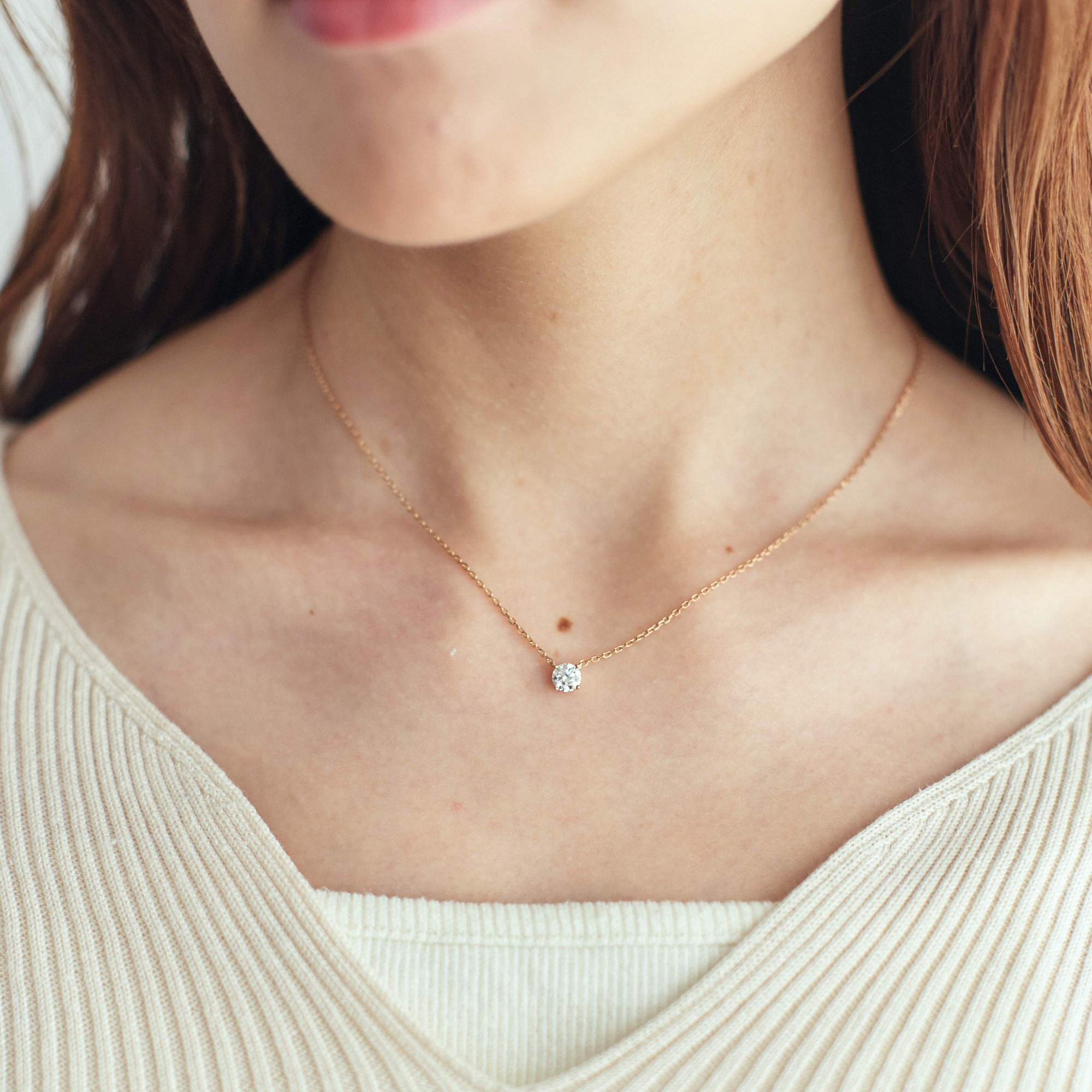 0.5カラット相当のラウンド型モアサナイトを使用した一粒ネックレス。 シンプルで上品なデザインと高級感でシーンや年齢を選ばないため、長くお使いいただけるアイテムです。