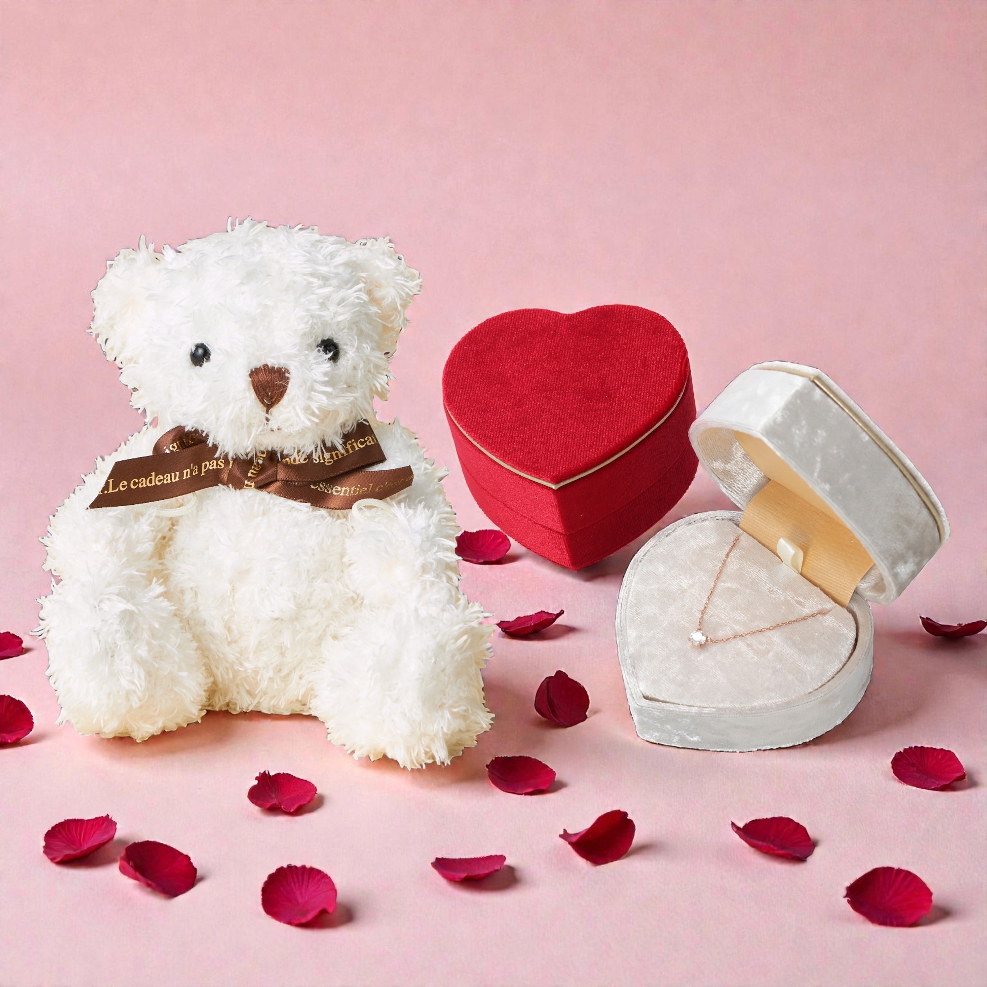 大口注文・法人のお問い合わせはこちら上品なデザインのモアサナイトが輝く一粒ネックレスと、毛並みにこだわったふわふわテディベアのセット。 特別な人へ届けたい、とっておきのギフトセットをご用意しました。 ※ネックレスは「シルバー・イエローゴールド・ピンクゴールド」より、お選びいただけます。 ※ジュエリーボックスは「レッド・ホワイト」より、お選びいただけます。 <セット内容> ・一粒ネックレス ×1 ・ジュエリーボックス ×1 ・テディベア ×1