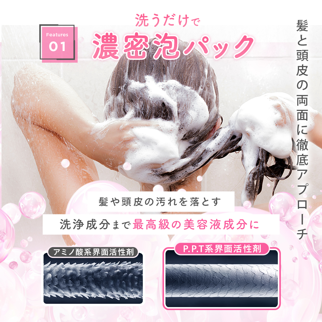 高保湿洗浄成分による濃密泡パックで”洗う”と”ダメージケア”の1本2役。 髪の成分と同じタンパク質だから芯まで素早く補修。 PPT系界面活性剤 ・ココイル加水分解コラーゲンK ・ココイル加水分解ダイズタンパクK ・ラウロイル加水分解シルクNa(洗浄成分)