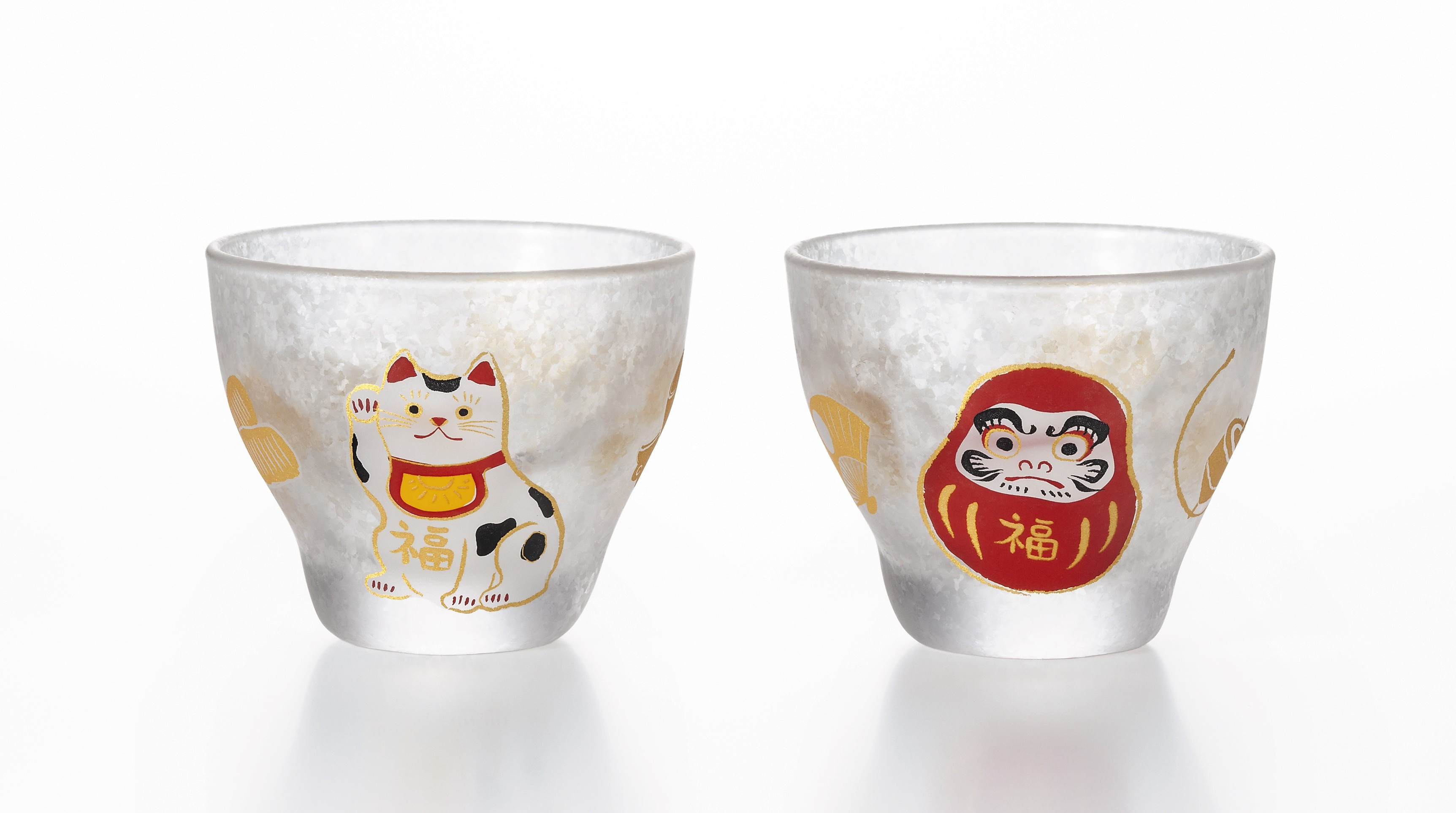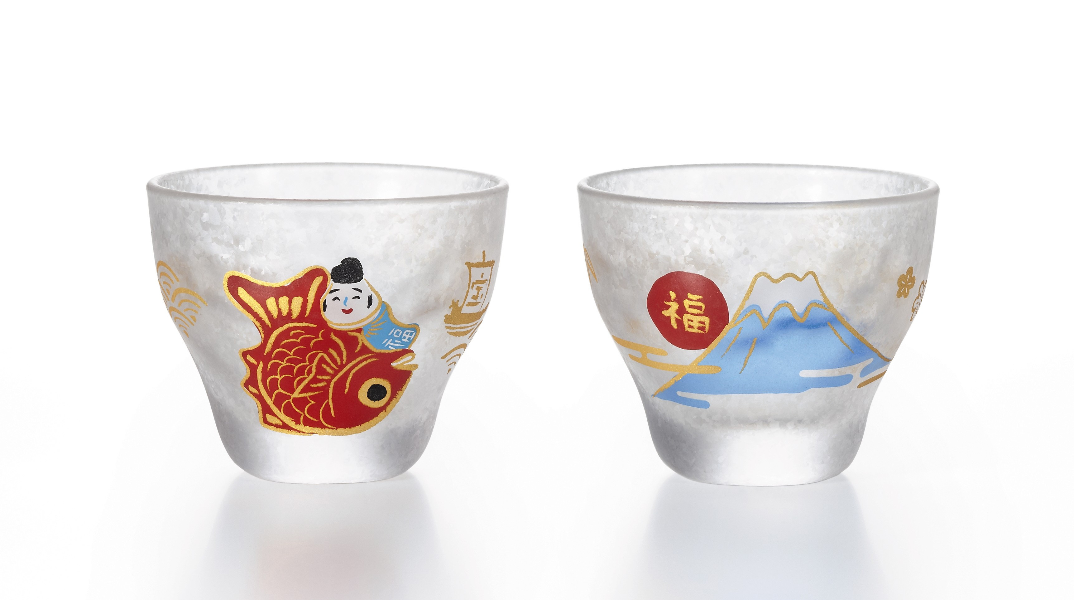 「縁起物」を描写し、硝子食器にうつした「めでたmono」。盃ペアセットです。門出やお祝いの席を彩る、特別で縁起の良いギフトとしておすすめです。
