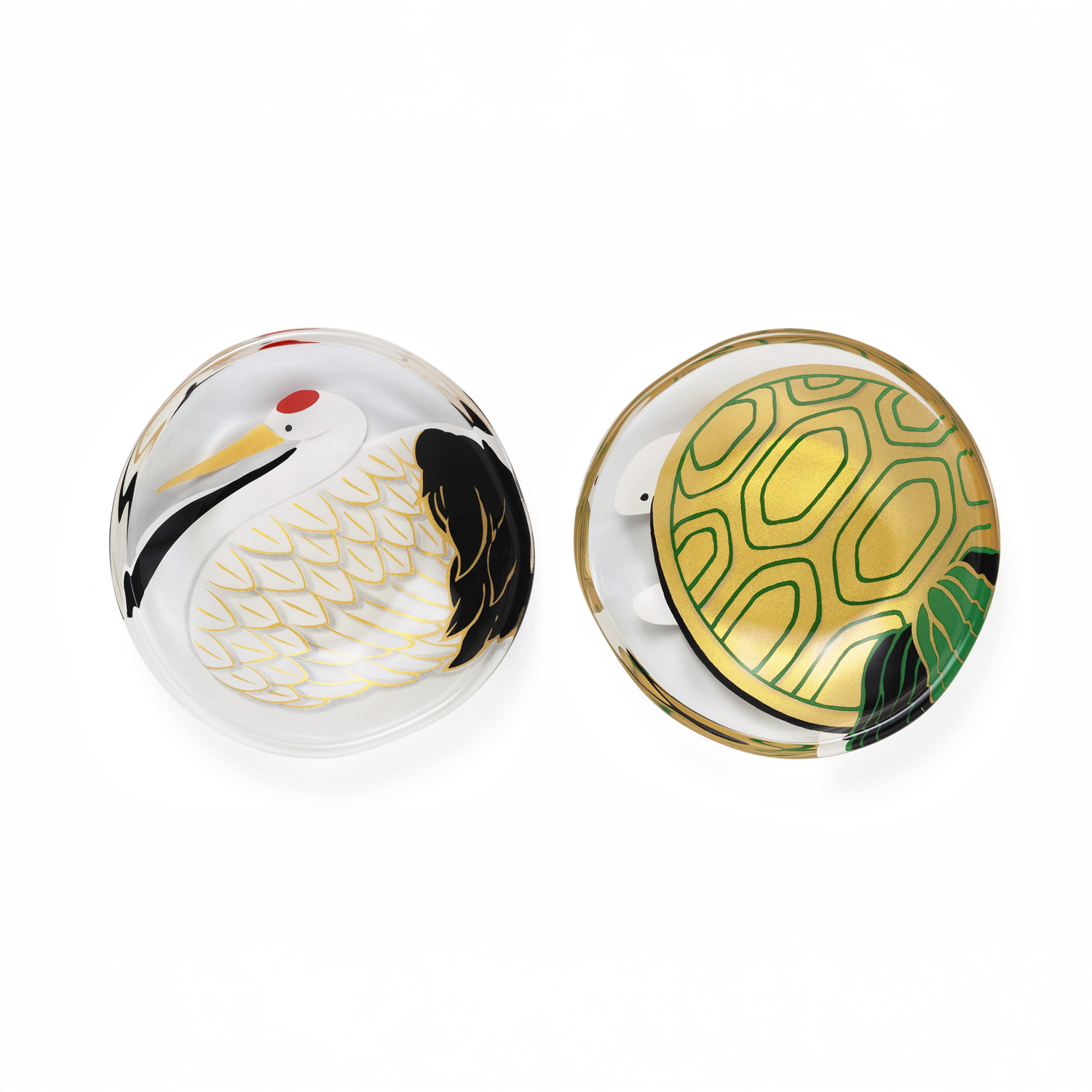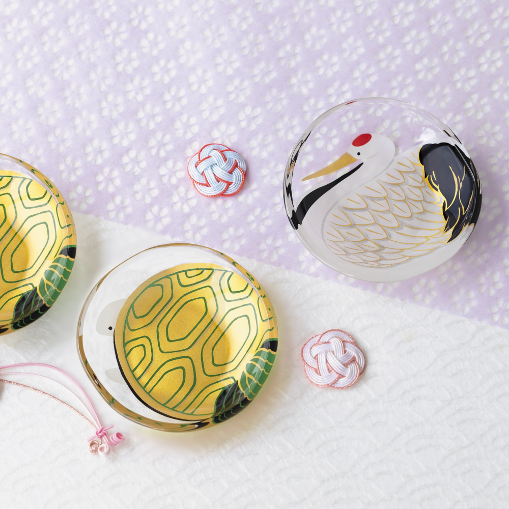 「縁起物」を描写し、硝子食器にうつした「めでたmono」。鶴亀豆皿ペアセットです。縁起の良いおめでたいモチーフの器は、大切な人の門出を祝う贈り物にぴったりです。