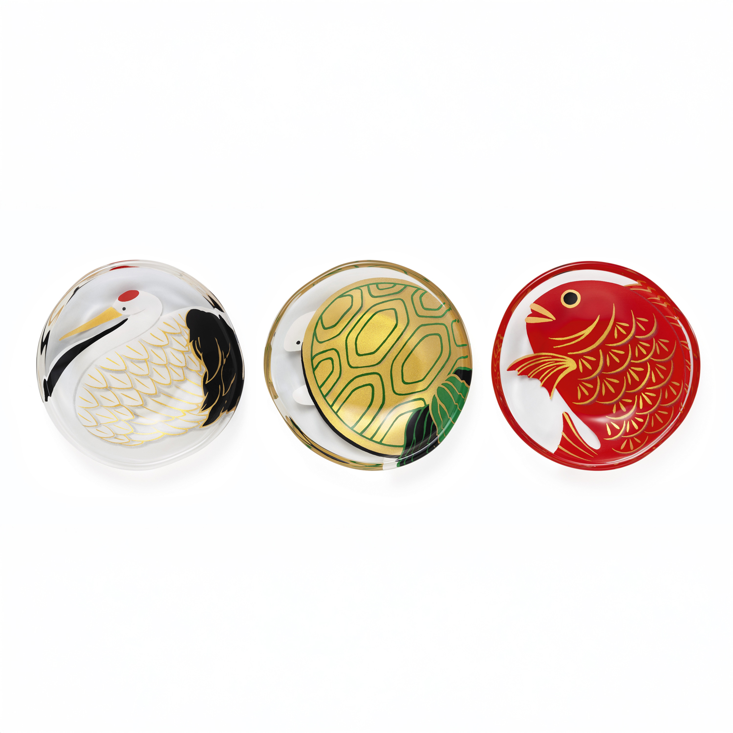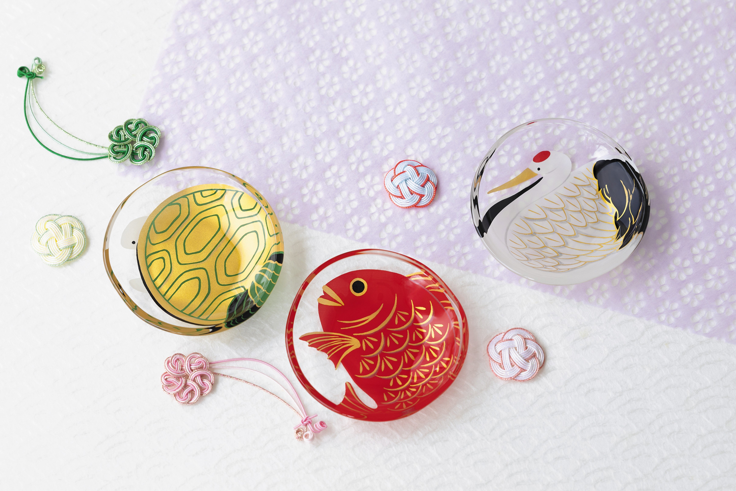 「縁起物」を描写し、硝子食器にうつした「めでたmono」。鶴亀鯛の豆皿3つセットです。縁起の良いおめでたいモチーフの器は、大切な人の門出を祝う贈り物にぴったりです。