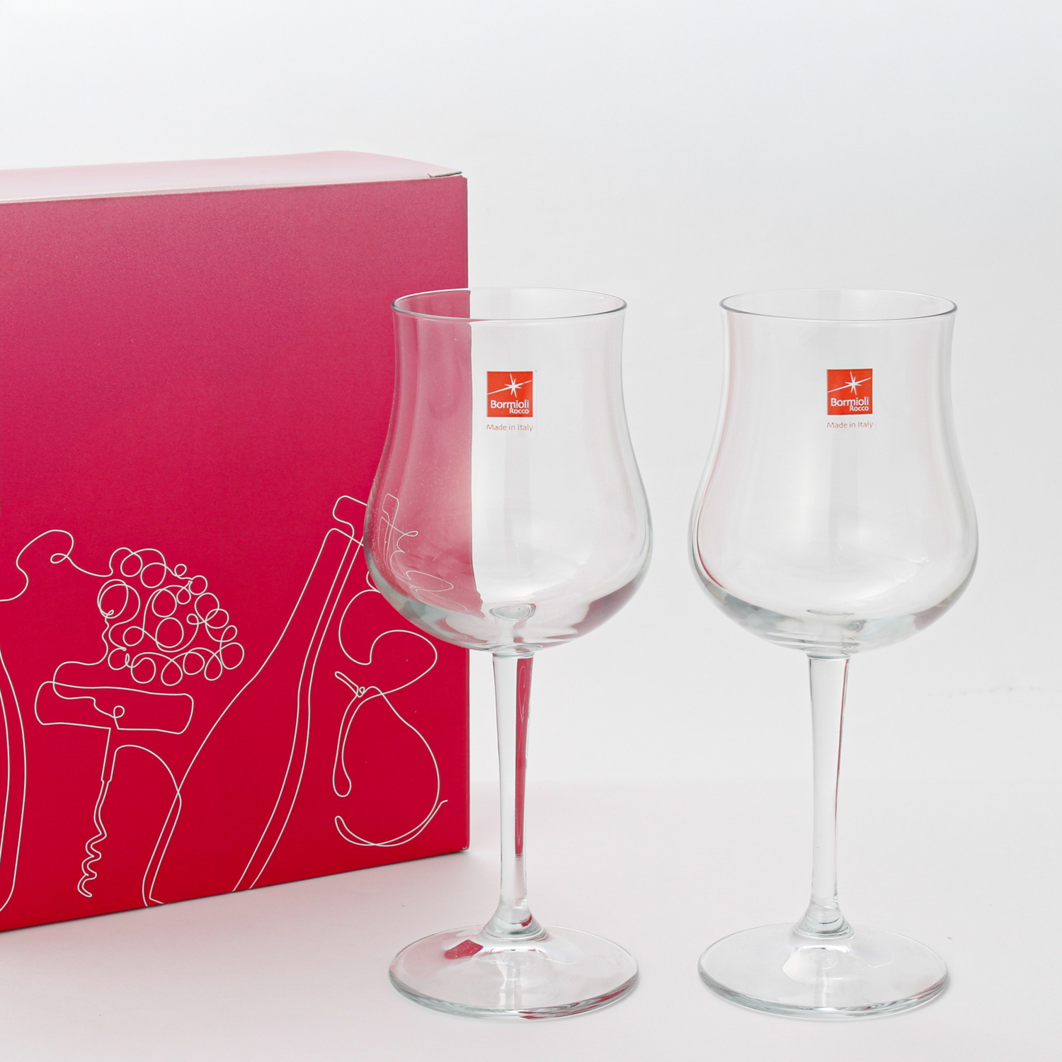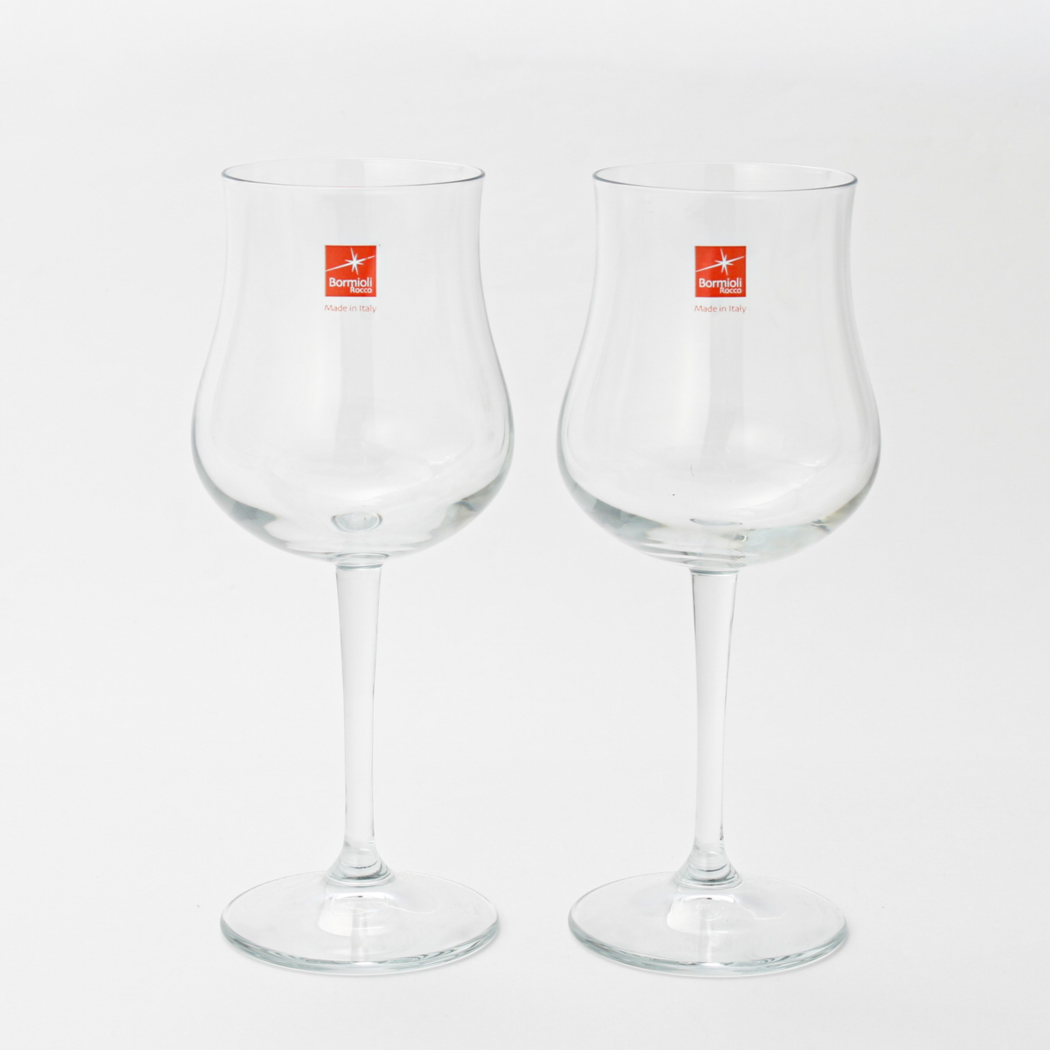 イタリアの老舗ボルミオリ・ロッコによるワイングラスセット。本体中央の丸みと口先のすぼまりが香りを引き立てます。赤・白どちらにも最適。オリジナルボックス入りで、記念日やカジュアルなギフトにもぴったりです。