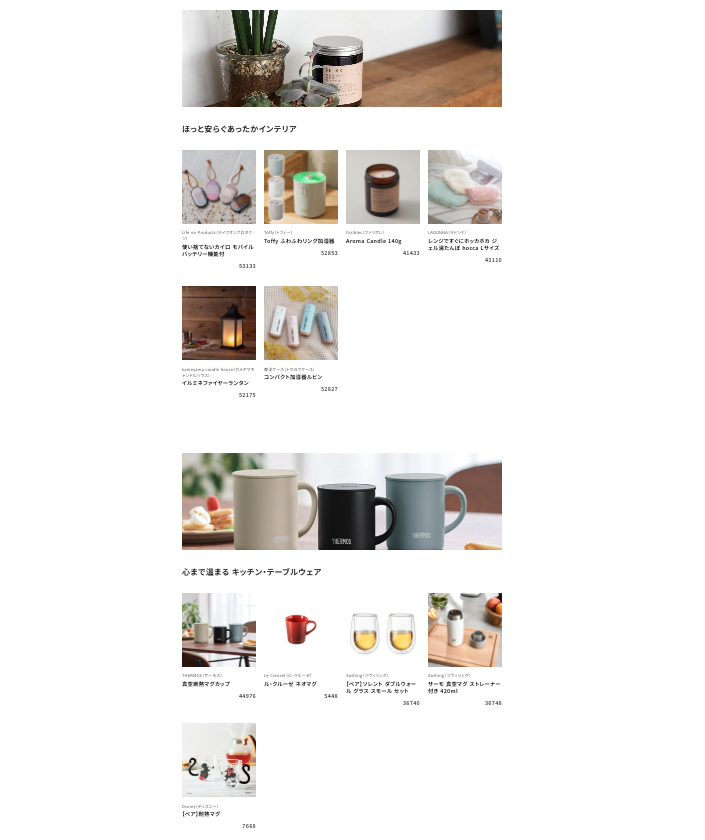 「心もカラダも温まる」をテーマに、ボディケア・ファッション・グルメや、インテリア・キッチンまで、ギフト専門オンラインショップならではの充実したラインナップをご用意しました。 ブランド例) Capon(チャポン)、to/on(トーン)、nerugoo(ネルグー)、絹屋、スターバックス、スープストックトーキョー、Toffy(トフィー)、THERMOS(サーモス)、ル・クルーゼ..etc