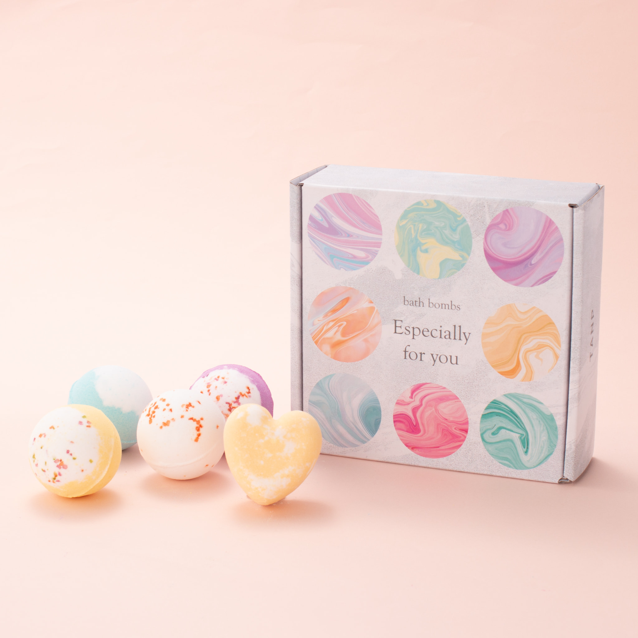 バスボム本体の色や香りだけでなくパッケージもカラフルなデザインで開封する前から心が弾むように設計しています。 友人へのちょっとしたプレゼントから、大切な人への贈り物まで。手にした瞬間から老若男女問わず喜んでいただけるようこだわりました。