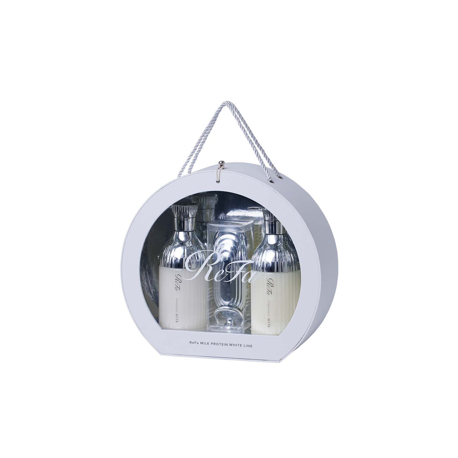 大口注文・法人のお問い合わせはこちらReFa MILK PROTEIN HAIR CARE SERIESの各商品を、ラウンド型の特別なオリジナルギフトBOXに詰め込み、さらに、ReFa MILK PROTEIN SHAMPOOを象ったオリジナルチャームをセットにしたスペシャルセットです。