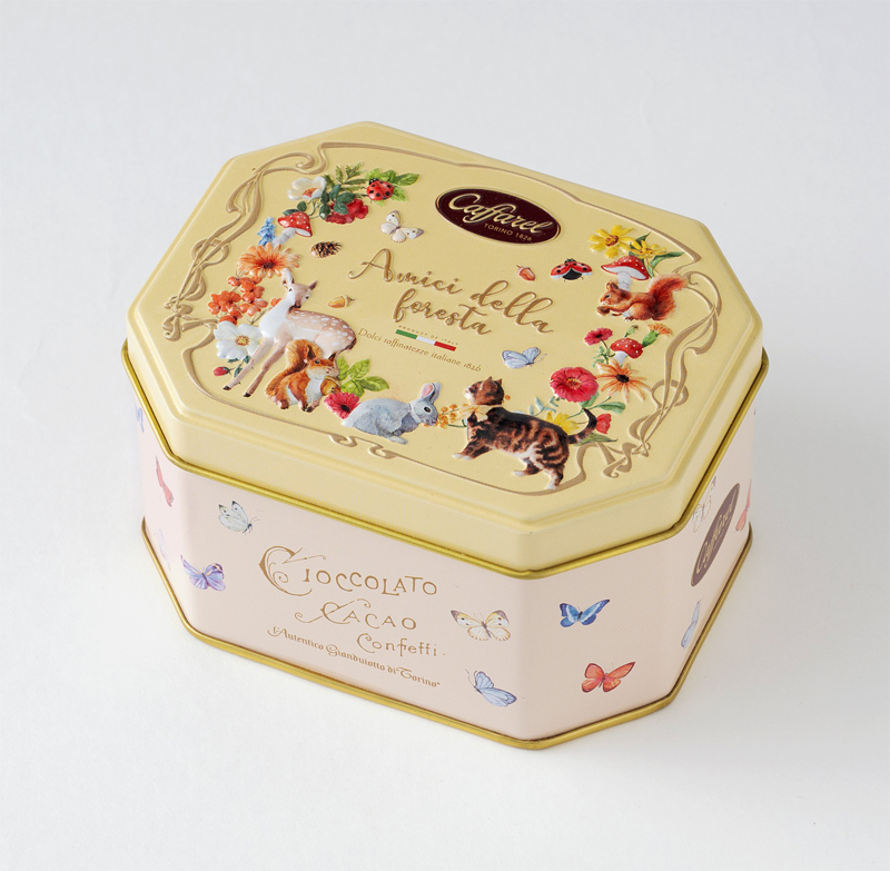 イタリアの老舗チョコレートブランド「Caffarel(カファレル)」のデザイン缶入りチョコレート。ヘーゼルナッツやきのこなどのチョコレート計8粒をアソートしました。缶には森に迷い込んだネコが動物達に出会うシーンが描かれています。