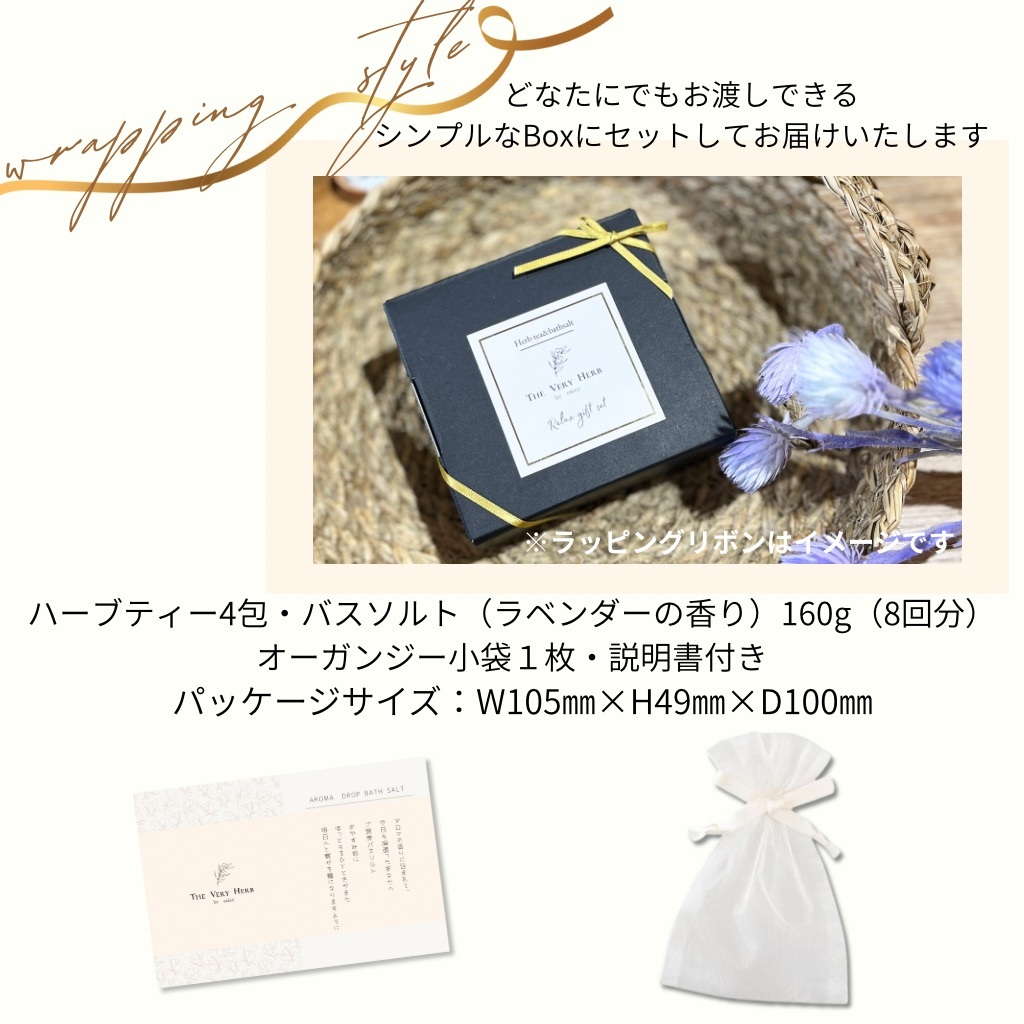 一日の疲れをリフレッシュできるリラックスギフトセット。体にホッとするやさしいハーブティーとラベンダーのアロマバスソルトのを豪華に詰め合わせました。大切なご家族やご友人の誕生日にはもちろん、自分用にもおすすめの癒しのギフトです。