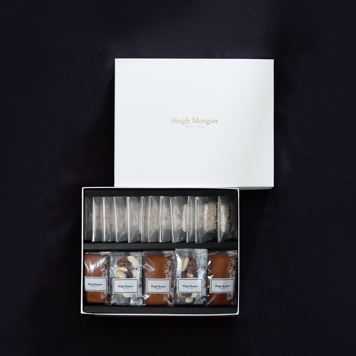 「Hugh Morgan」こだわりの焼き菓子3種類の詰め合わせ。バニラの香り豊かなサブレ・ヒューモルガンと焦がしバターとバニラが贅沢に香るフィナンシェ、塩気のあるバニラの糖衣をナッツにまとわせたカシューマカダミア・ヴァニーユをお楽しみいただけます。