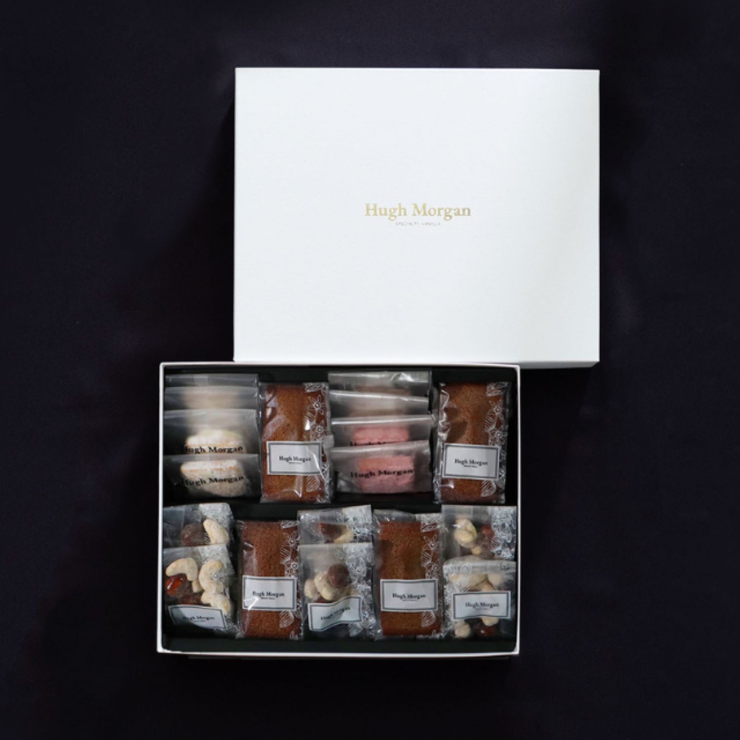 大口注文・法人のお問い合わせはこちらバニラがふんわり香るサブレ3種類とふんだんにバニラを使用したフィナンシェ、絶妙な塩気がバニラの甘みを引き立てるナッツを詰め合わせました。 「Hugh Morgan」の焼き菓子5種類をたっぷり楽しんでいただけるギフトです。