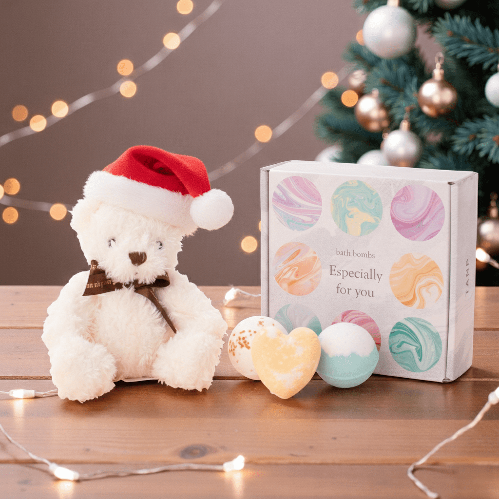 まるで宝石箱!TANPオリジナル9種のカラフルな手作りバスボムと、愛らしいテディベアのセット。オーガニック原料&うるおい成分配合で、心も体も癒やす贅沢なバスタイムをお届けします。今なら限定のクリスマスラッピングも可能。大切な人へ、見て楽しみ使って癒される特別な冬ギフトです。