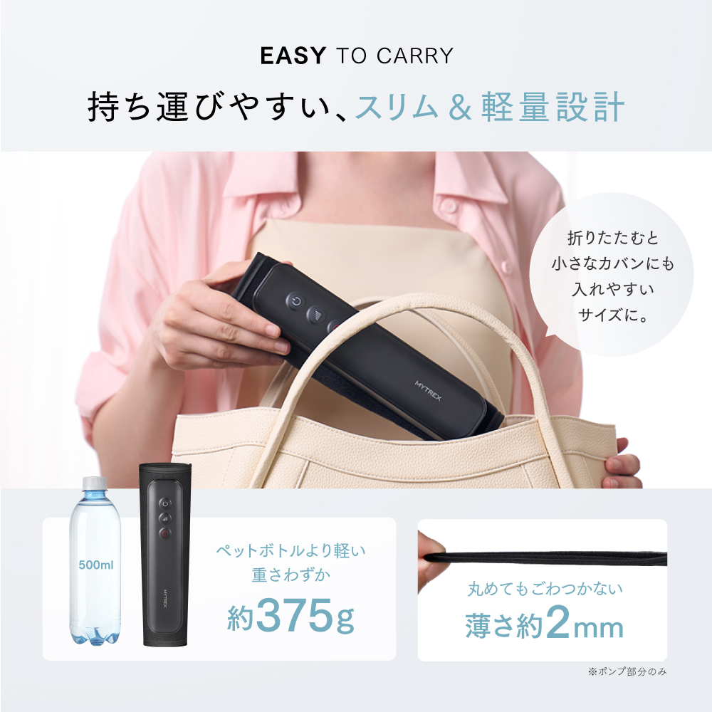 大口注文・法人のお問い合わせはこちら薄さ約2mmのスリムボディに、7つのエアポンプを搭載。持ち運びに便利な軽量モデルとは思えないほど、パワフルかつ多彩な刺激をふくらはぎに届けます。 自宅でのリラックスタイムはもちろん、仕事や家事の合間、旅行先でも「ながらケア」が可能。頑張り続ける足にそっと寄り添う、特別な休息時間を贈りませんか。