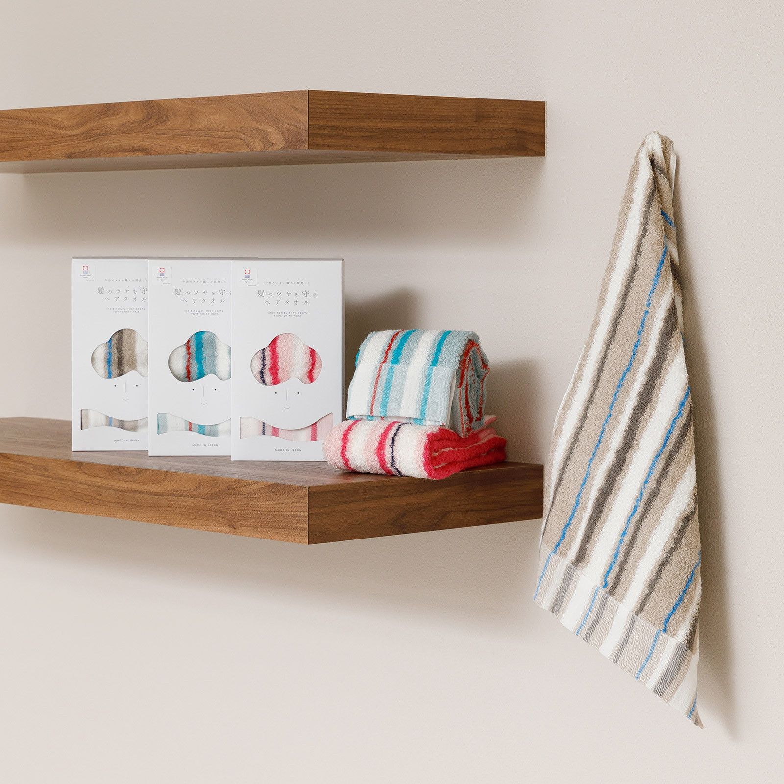 一般的なフェイスタオルより10cm長く、ロングヘアの方でもすっきりと髪をまとめることができます。