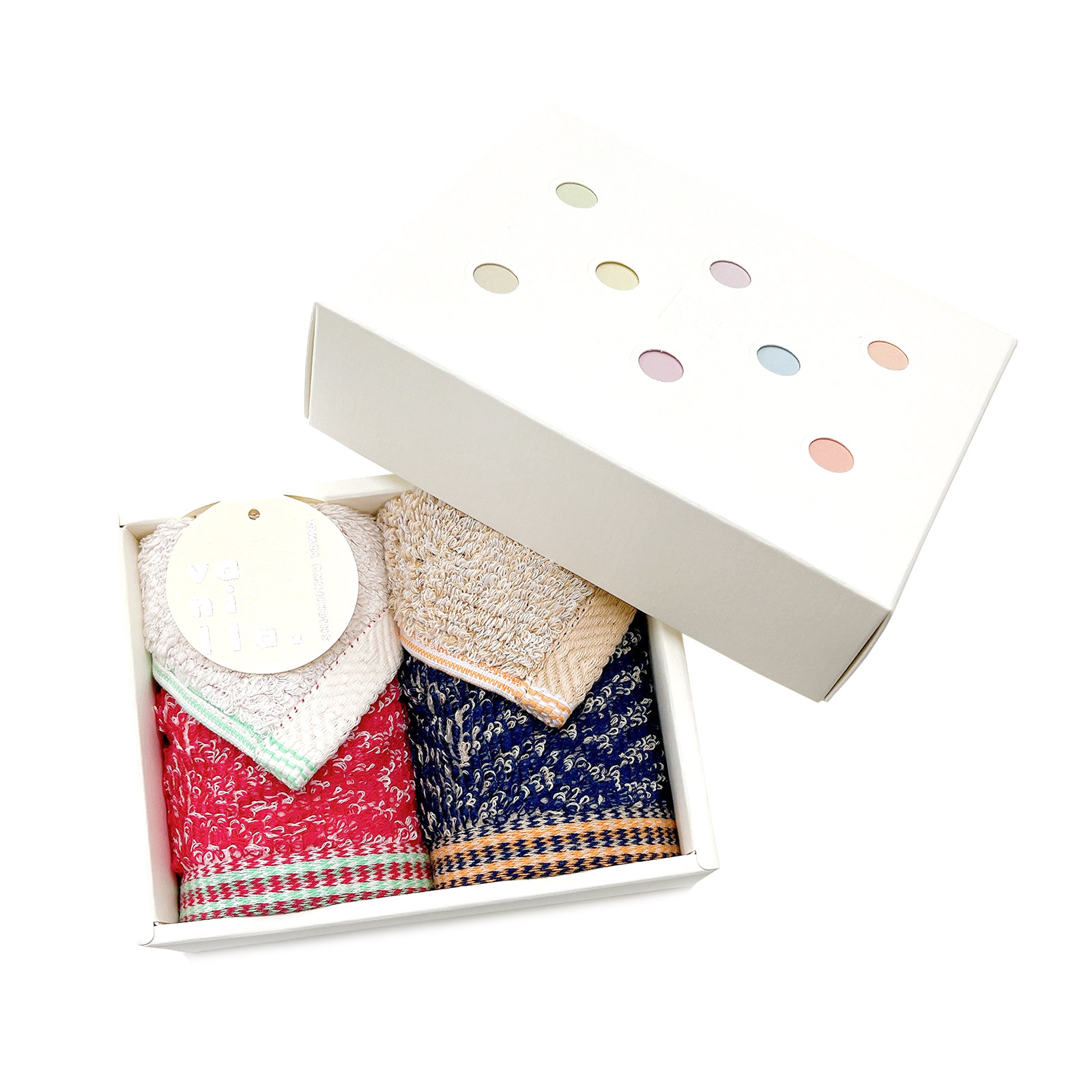 大口注文・法人のお問い合わせはこちら表裏で異なる表情を楽しめるハンカチタオル2枚セット。 オーガニックコットンを使用した肌にも環境にもやさしいタオルです。