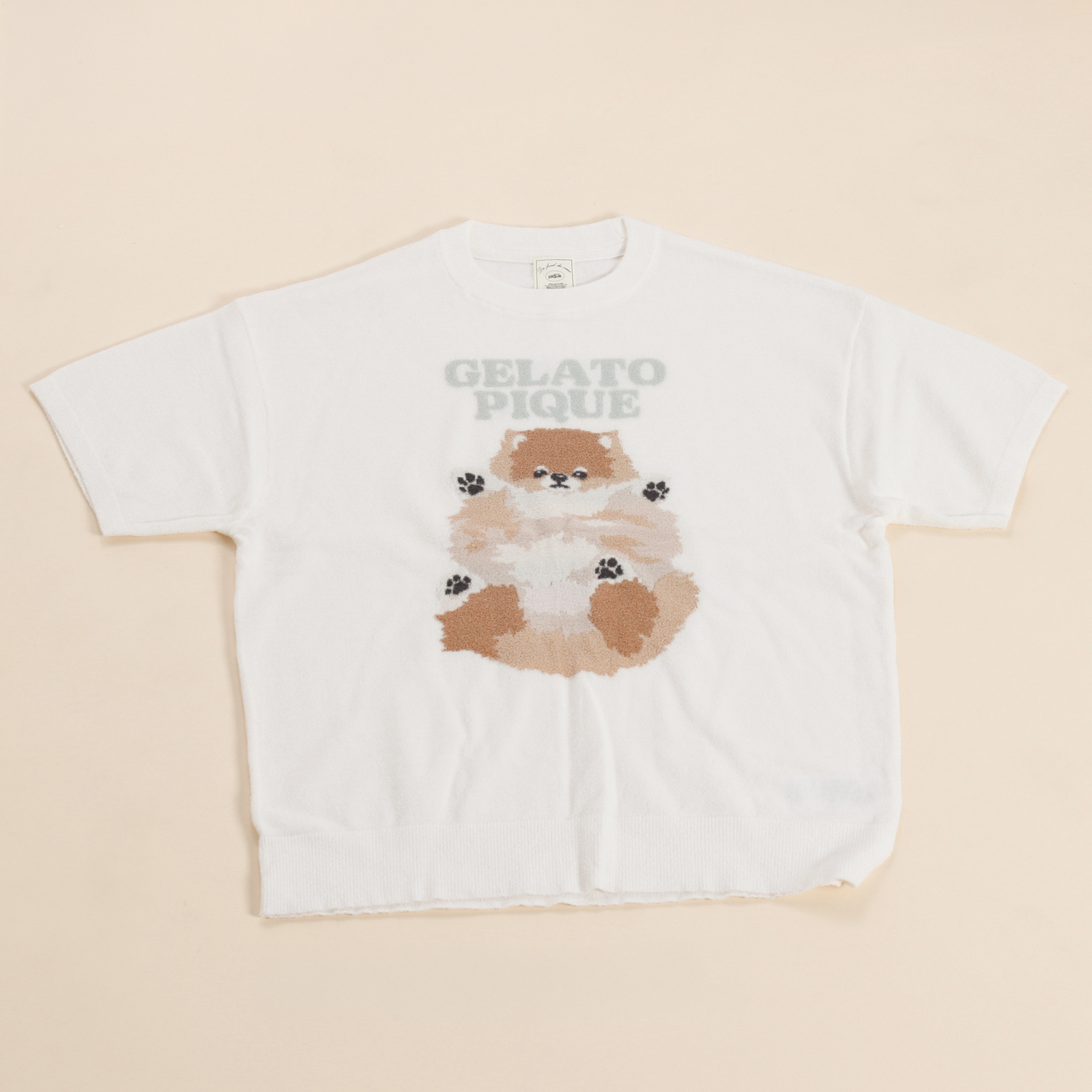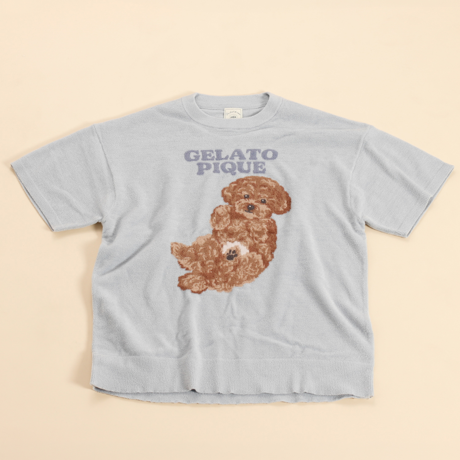 ごろんと寝そべりお腹を見せるワンちゃんを描いたニットシリーズです。なめらかでとろけるような肌触りのニットを使用した、半袖のジャガードプルオーバー。ゆったり着用いただける定番デザインで仕上げました。甘えん坊な表情や、ほんのりピンクなお腹の色ま で表現した絵柄が、袖を通すたびに心を癒してくれそう。色は全3色でトイプードル柄のブルー、ポメラニアン柄がクリーム、ビションフリーゼ柄はライトピンクをご用意しました。