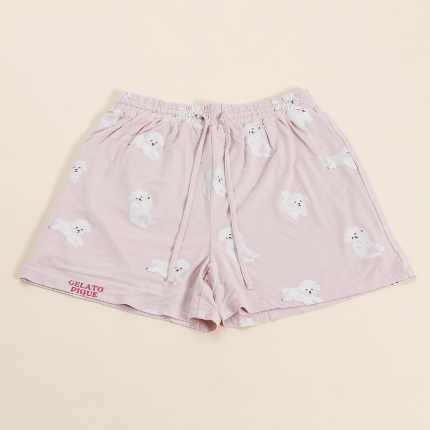 ごろんと寝そべりお腹を見せたりお座りしたり、いろんなポーズのワンちゃんをプリントした、ファミリーでお楽しみいただけるドッグ柄シリーズです。とろみのあるレーヨンを使用した、総柄プリントのショートパンツ。季節の変わり目にちょうど良い素材感で、短すぎない丈感がポイントです。明るい気分を演出する春らしいカラーリングも魅力。右後ろにポケットも付いています。色はポメラニアン柄のクリーム、ビションフリーゼ柄のライトピンク、トイプードル柄のブルーの3色をご用意。