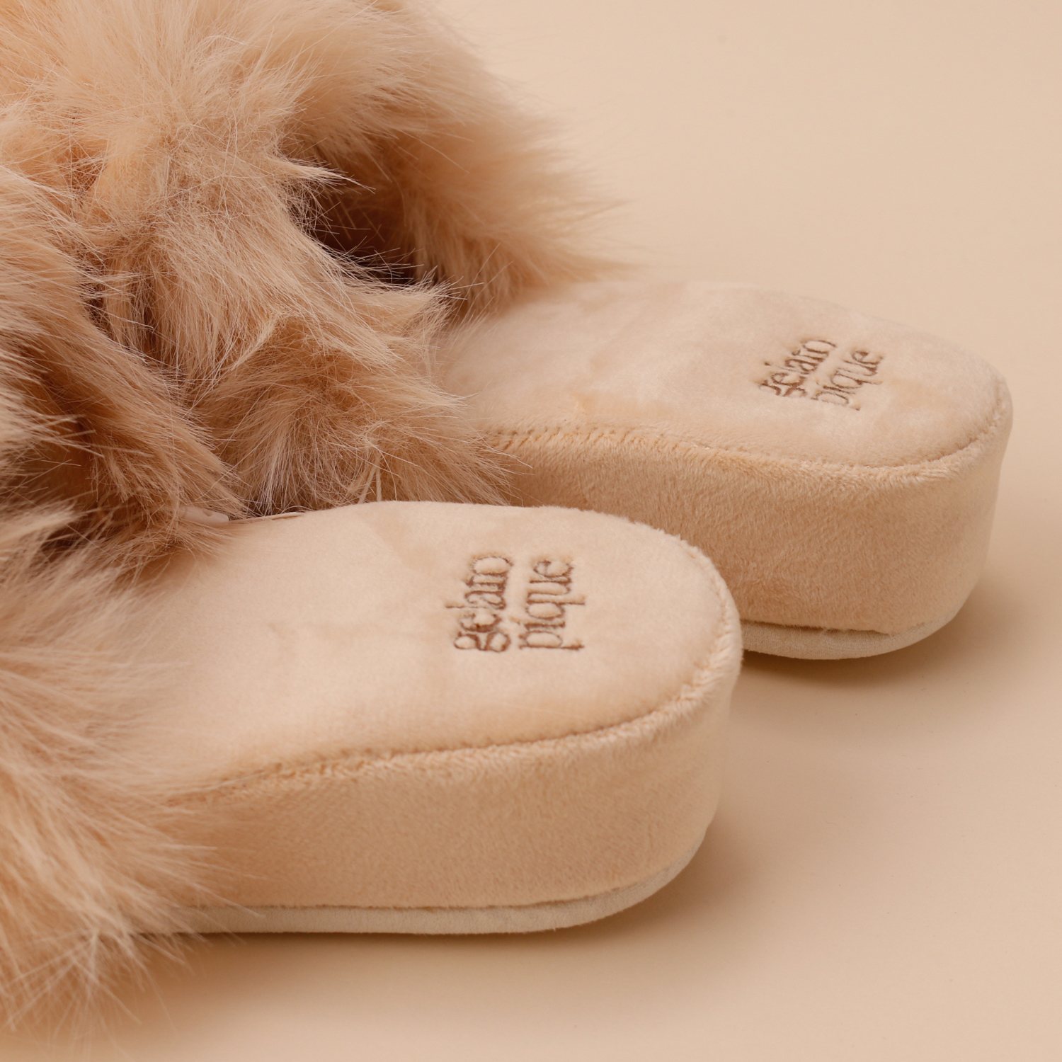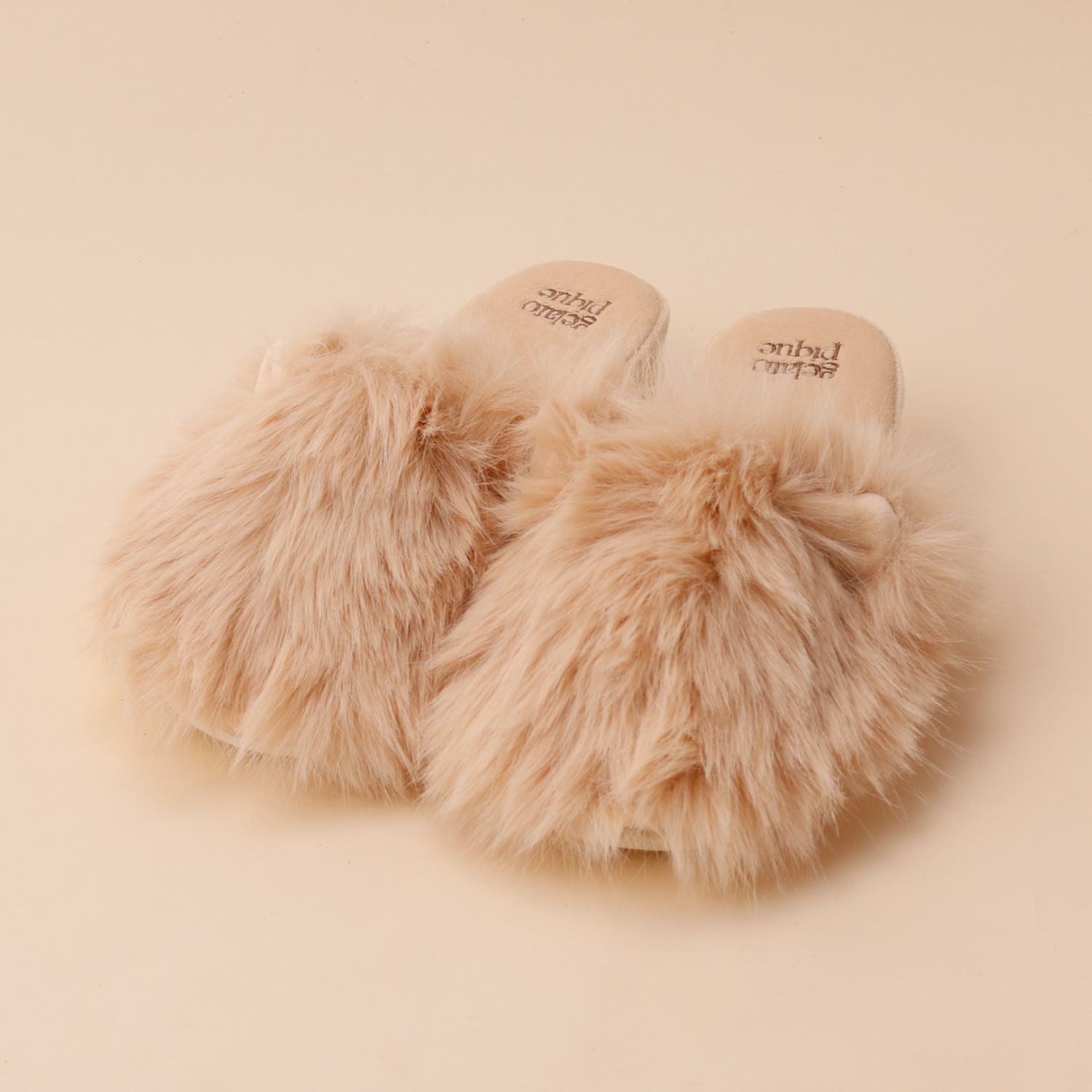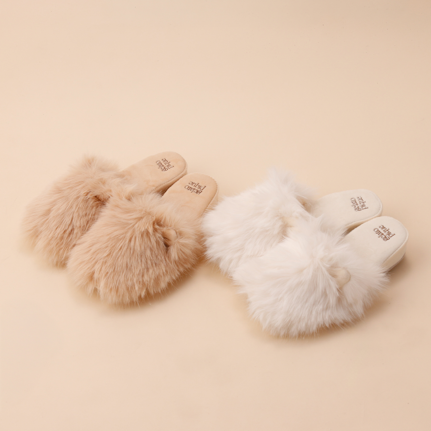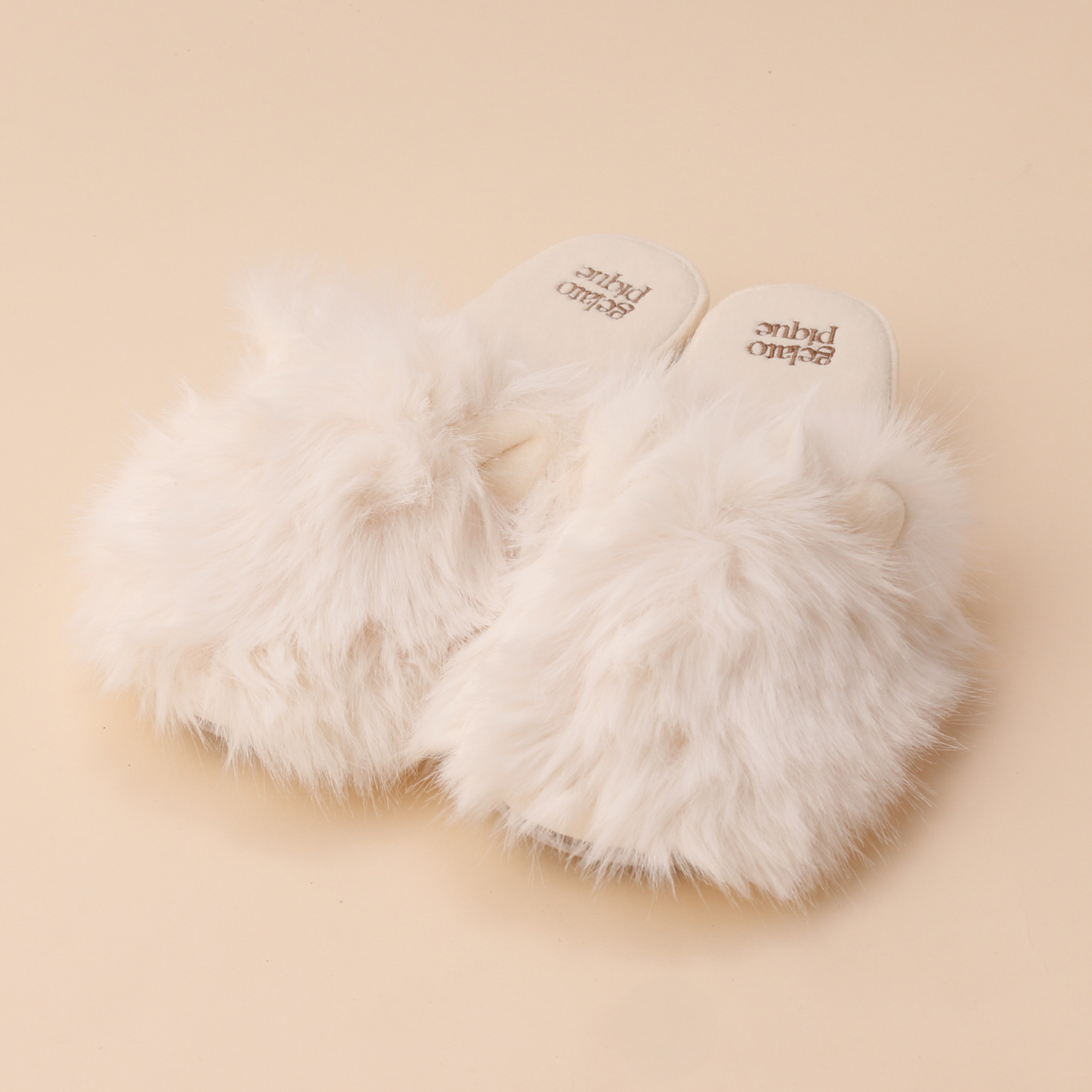ロングヘアの猫のようなふわふわフェイクファーが可愛いルームシューズです。アッパーには小さな猫耳をあしらい、遊び心たっぷり。内側はベロア素材で肌触りもなめらかです。かかとのロゴ刺繍や、歩きやすいヒール高もポイント。猫好きな方へのプレゼントにもおすすめです。