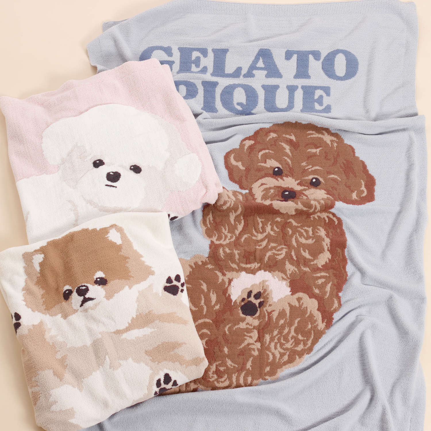 ごろんと寝そべってお腹を見せる、甘えん坊なワンちゃんたちがたまらなく愛おしいニットブランケットです。なめらかでとろけるような肌触りに包まれながら、ほんのりピンクに染まったお腹や無防備な表情に癒されること間違いなし。トイプードル(ブルー)、ポメラニアン(クリーム)、ビションフリーゼ(ライトピンク)の3つの犬種からお選びいただけます。リラックスタイムのお供や、犬好きな方へのとっておきのギフトにぴったりです。