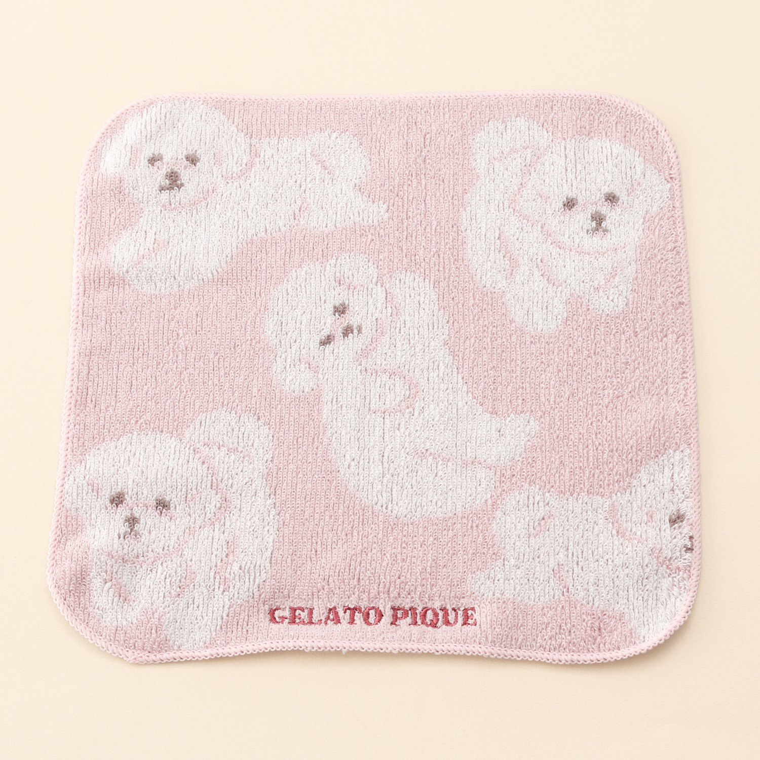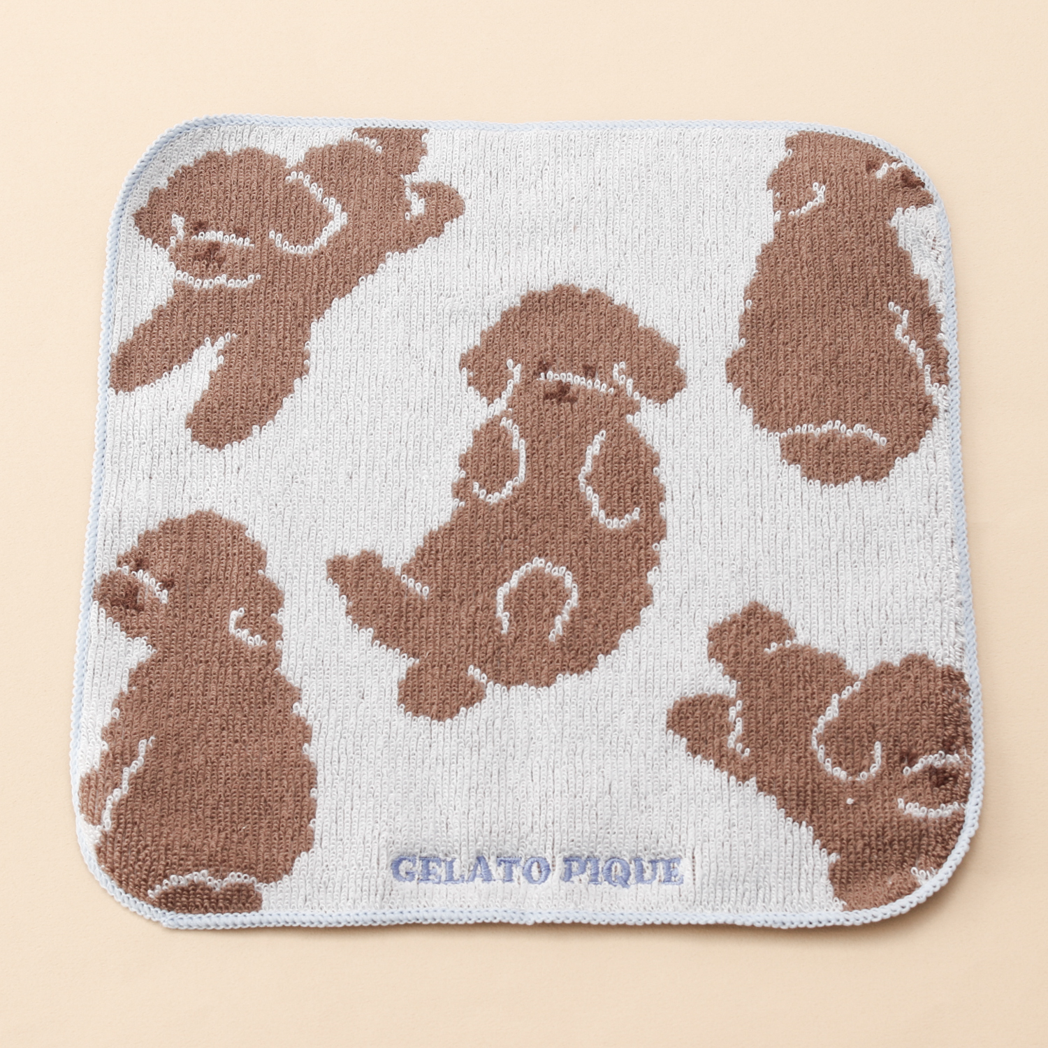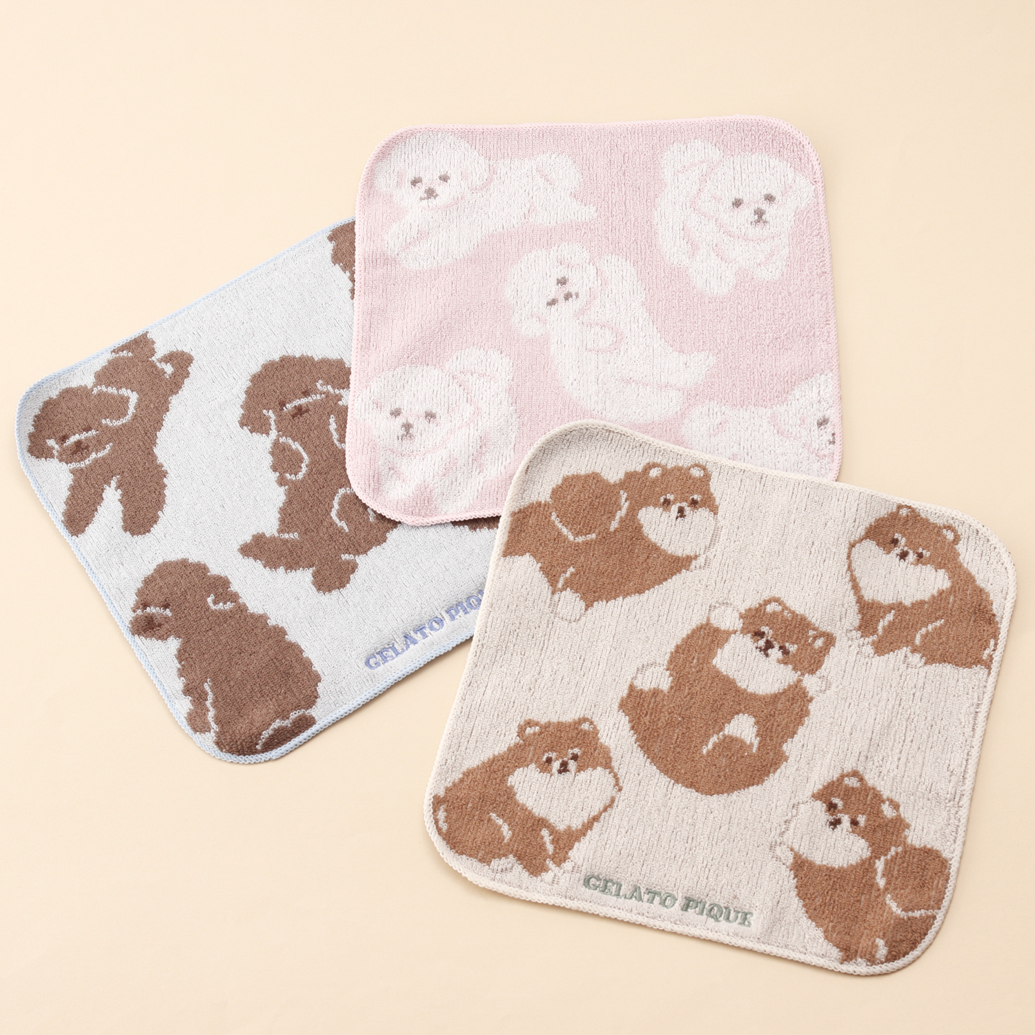 ごろんと寝そべりお腹を見せたり、お座りしたり、いろんなポーズのワンちゃんをジャガードで表現したドッグ柄シリーズのハンドタオルです。コロンとしたフォルムや、甘えん坊な表情など細かい部分にこだわりました。色はポメラニアン柄のオフホワイト、ビションフリーゼ柄のライトピンク、トイプードル柄のブルーの3色展開。