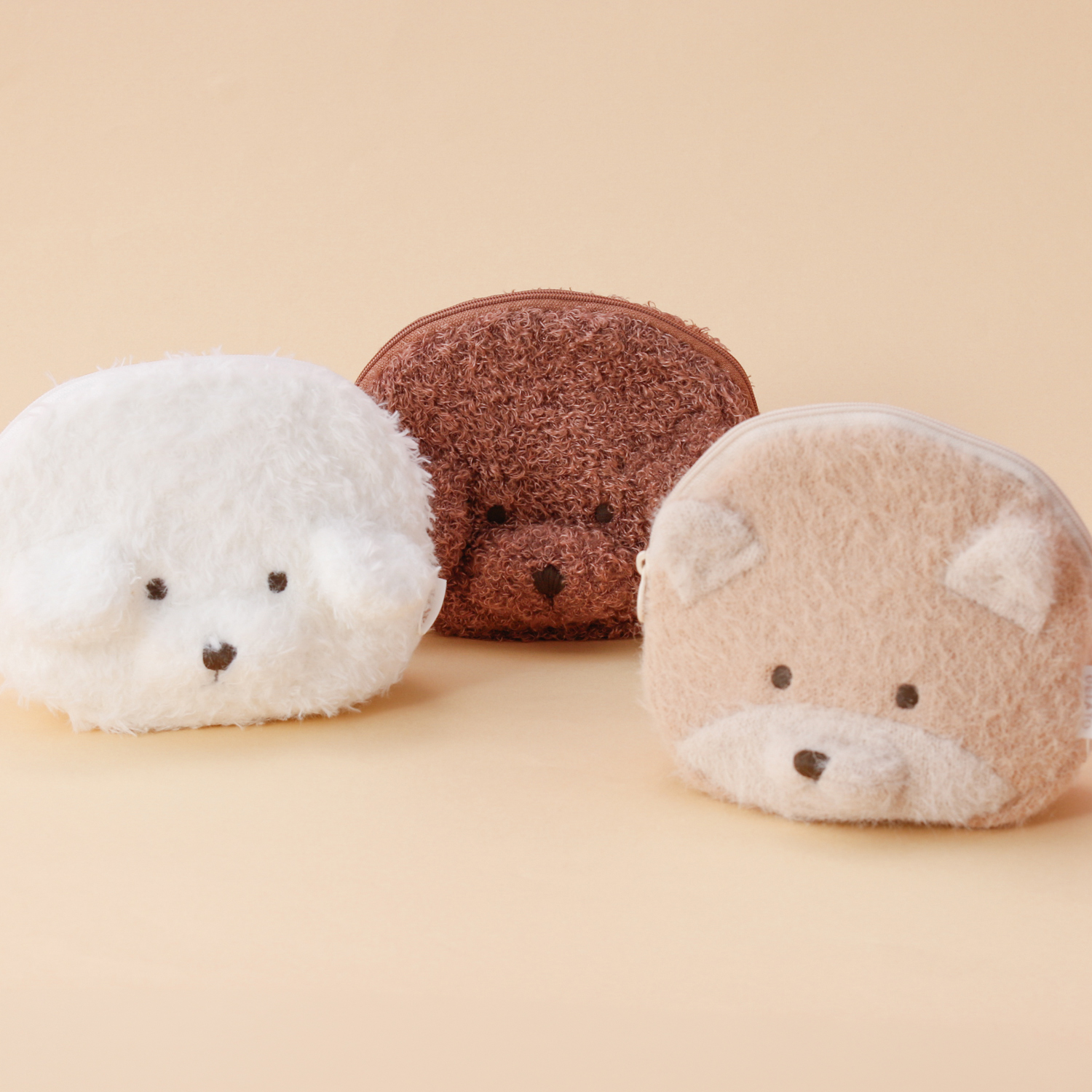 トイプードル、ポメラニアン、ビショフリーゼのお顔をモチーフにした、もふもふ素材のポーチが登場。それぞれの犬種の毛並みに合わせた糸を使用し、思わずなでたくなるような可愛い質感で仕上げました。マチもしっかりついているので、普段使いのコスメポーチ等にご使用いただけます。
