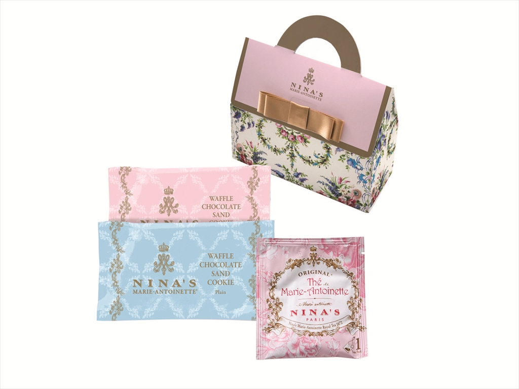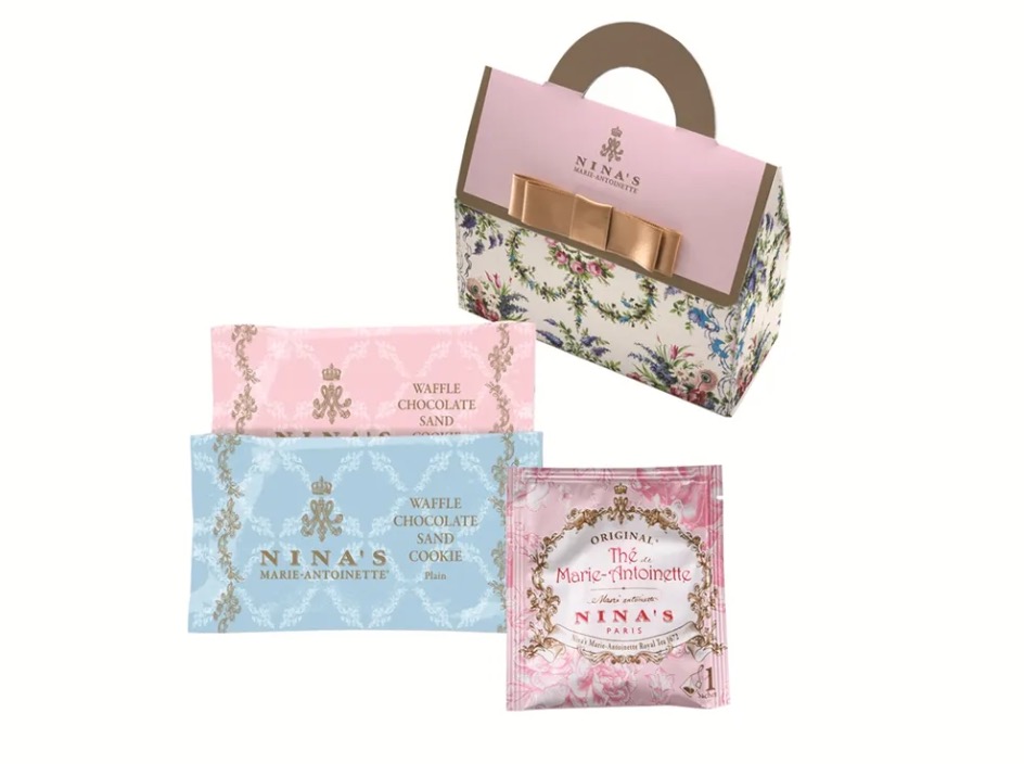 王妃マリー・アントワネットのラグジュアリー・ティーをイメージした、老舗フランス紅茶ブランド「ニナス」の紅茶と、チョコレートをサンドした香ばしいワッフルクッキーをセットでお届けします。ちょっとしたお礼やお返しにぴったりのバック型デザインのギフトです。