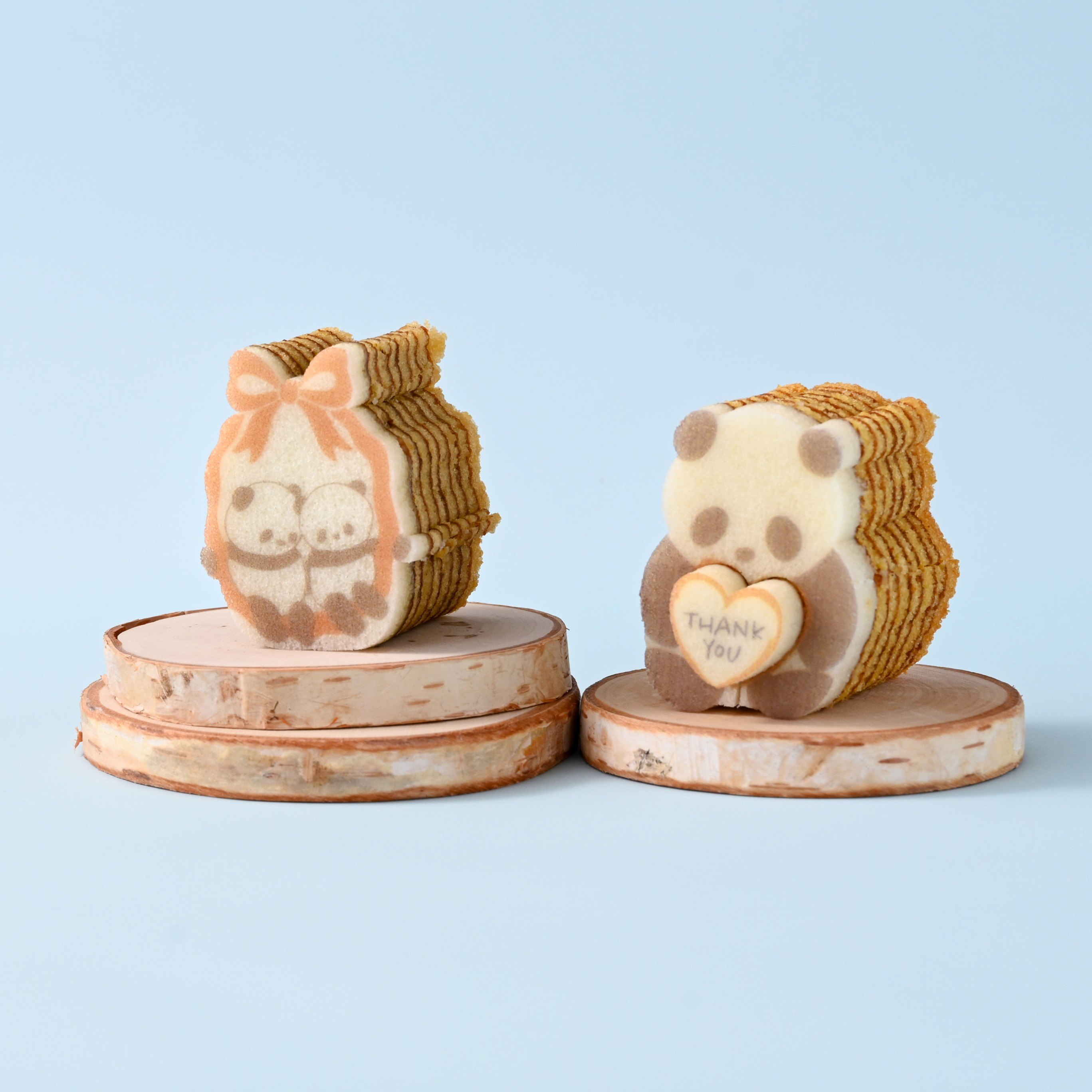 はちみつの芳醇な香りとほど良い甘味のしっとり生地を、丁寧に焼き重ねた平焼きバウム。いちばん上の真っ白生地をキャンバスにして、「ありがとう」のハートを抱えたパンダのプリントとカットをほどこしました。