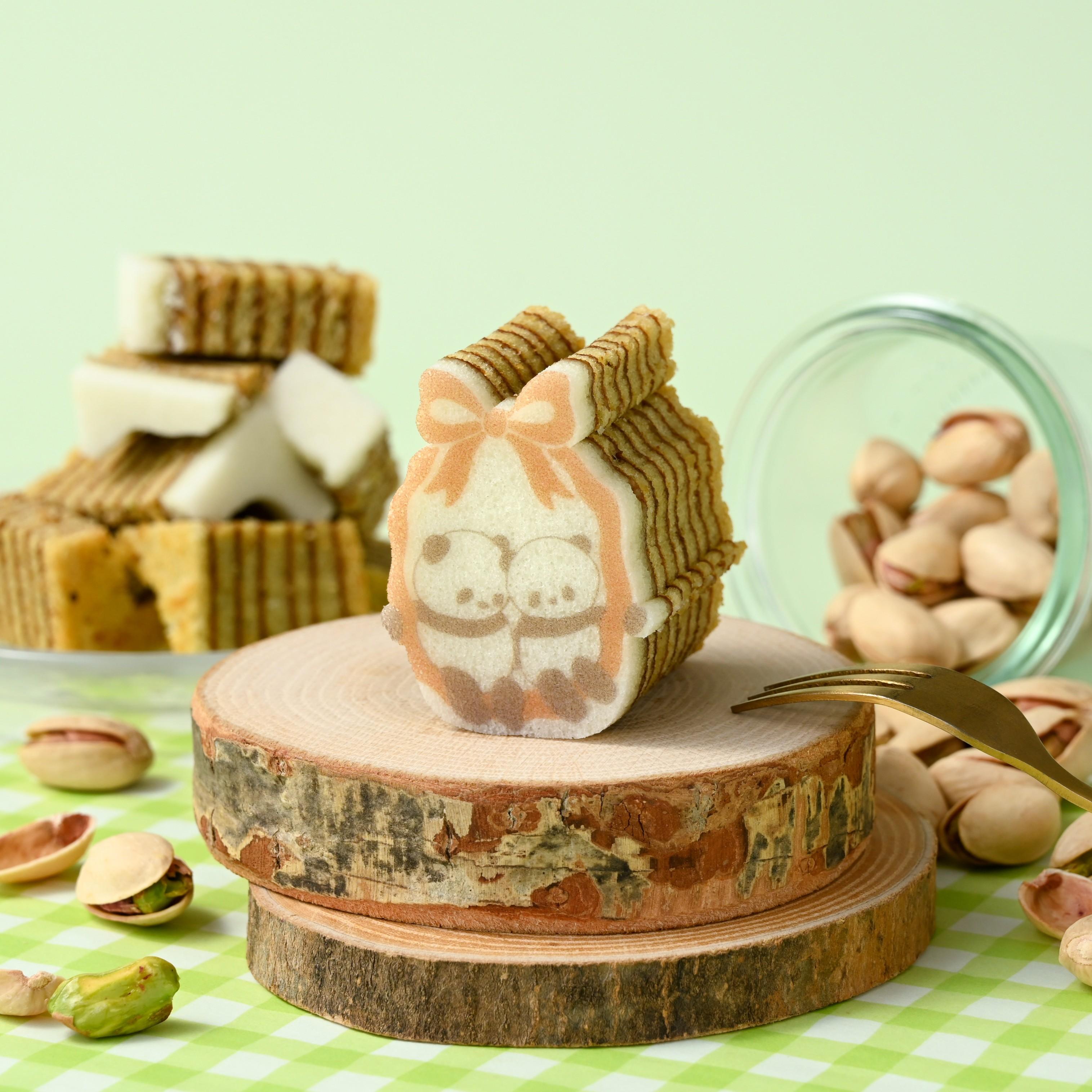 香ばしいピスタチオの豊かな香りとやさしい甘みを重ねた生地を、丁寧に焼き重ねた平焼きバウム。いちばん上の真っ白生地をキャンバスにして、仲良くリボンでブランコをするパンダのプリントとカットをほどこしました。
