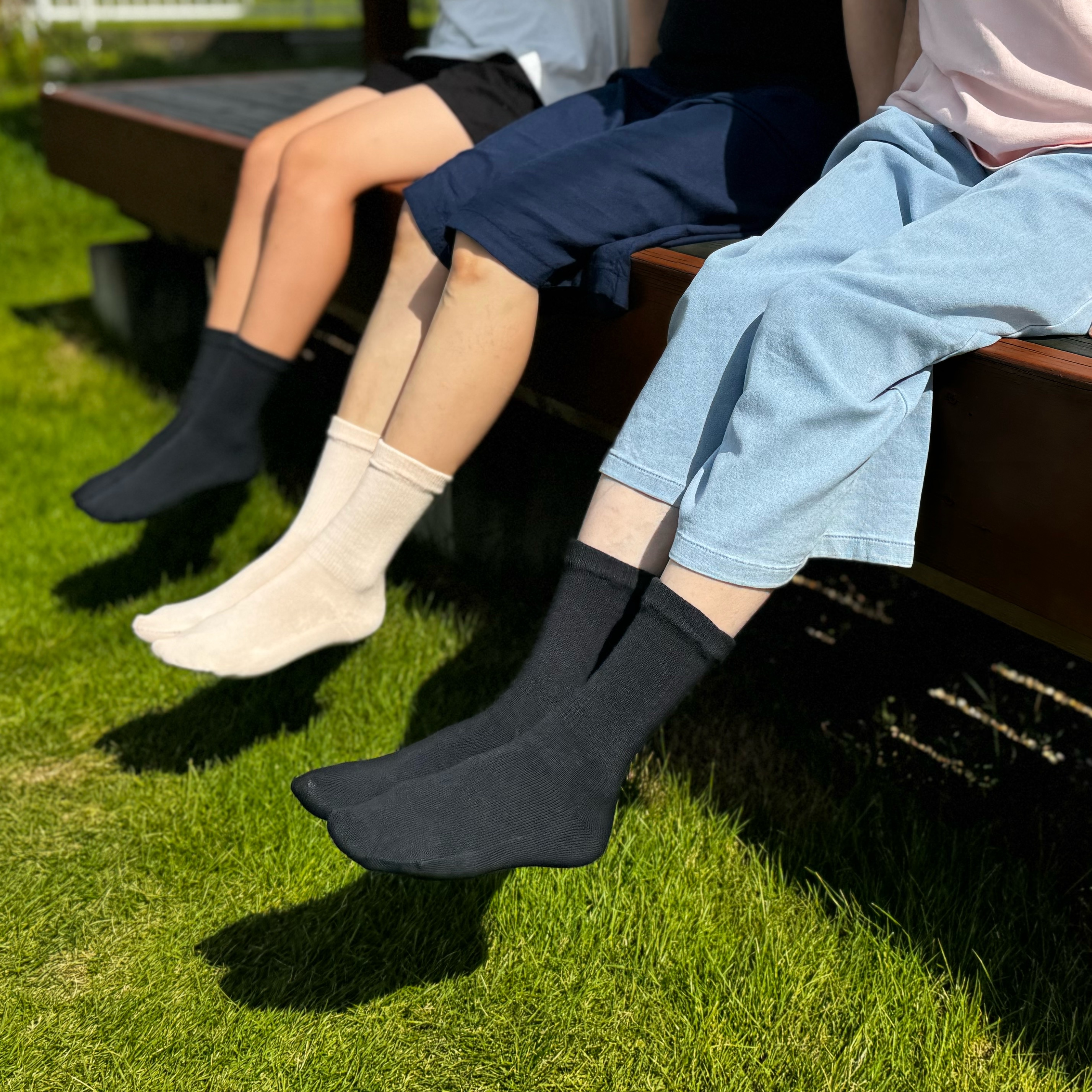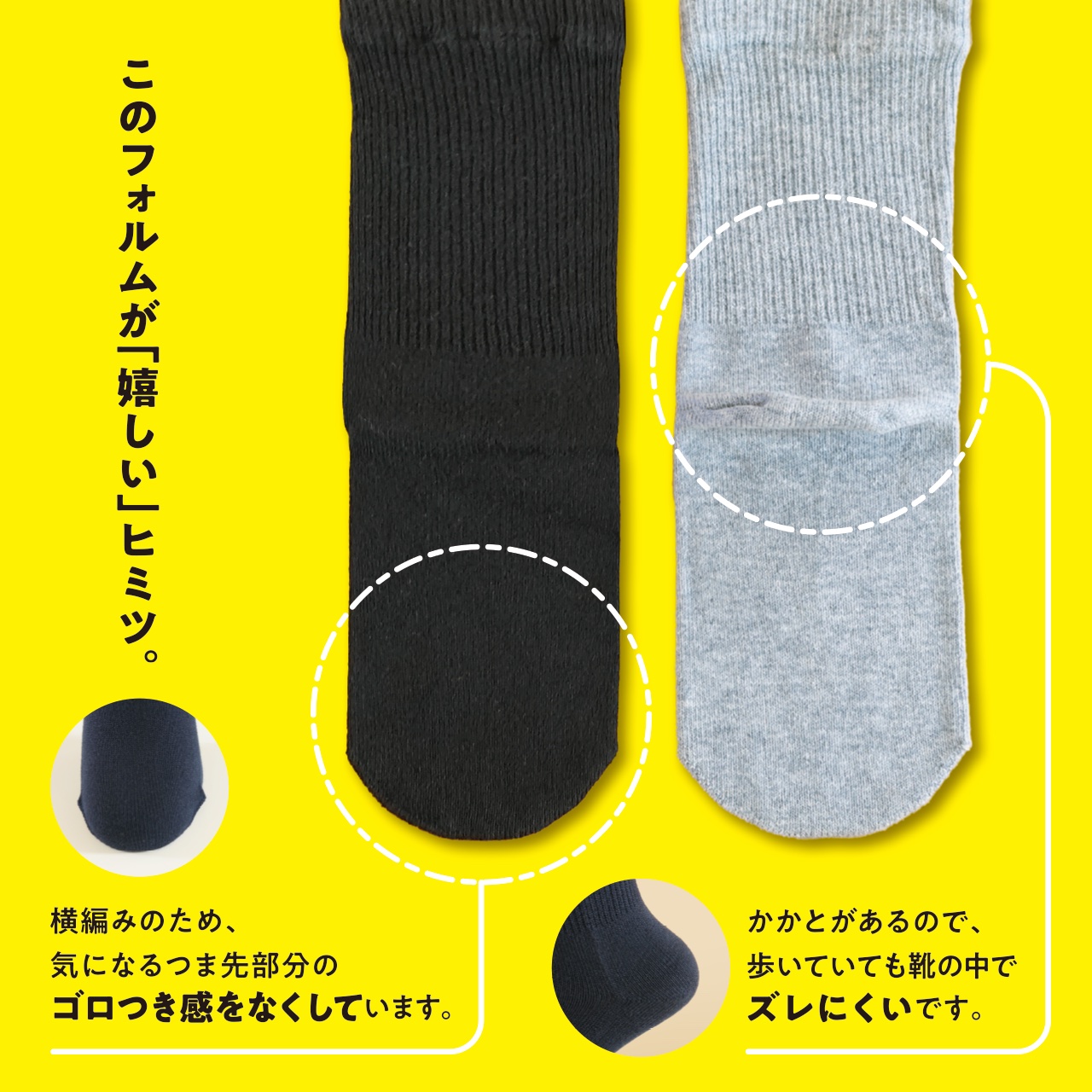 つま先から、足の甲やふくらはぎまで「しめつけない」ゆったりとした設計。つま先に縫製をしない編み方のため、長時間靴を履いても足の指が痛くなりにくいのも嬉しいポイントです。