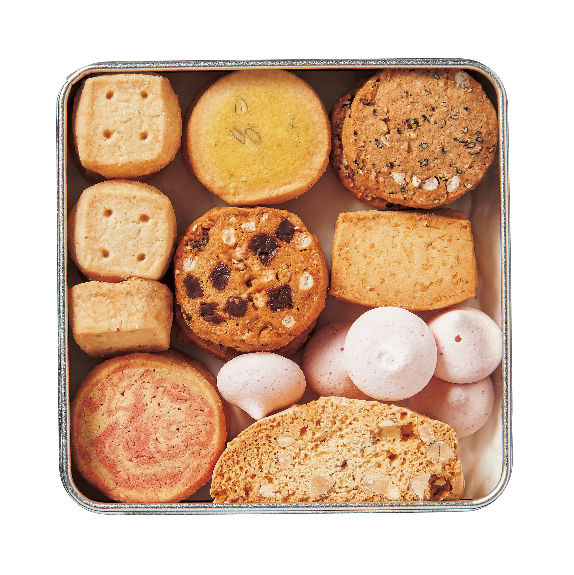 ・いちごメレンゲ、ショートブレット×各5個 ・ストロベリーマーブル、紅茶×各3個 ・ビスコッティープレーン、ビスコッティーココア、五穀、玄米チョコ、チョコマーブル、パンプキン、チーズ×各2個 さまざまな形や味の11種類のクッキーは、どこか懐かしい美味しさ。小さなお子様からご年配の方まで、みんなが笑顔になる心温まるギフトです。