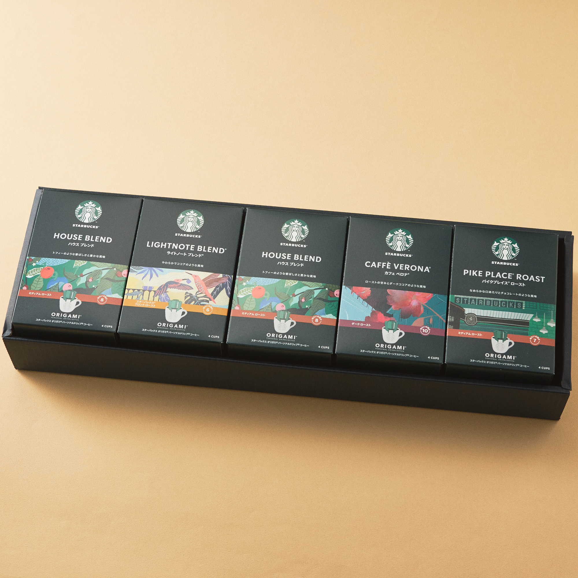 一杯分の美味しさを味わえるドリップタイプのスターバックスオリガミ。ちょっとしたお呼ばれや手みやげに手頃なサイズの、人気のフレーバー2種の詰合せです <セット内容> ・ハウス ブレンド×3袋 ・カフェ ベロナ®×2袋
