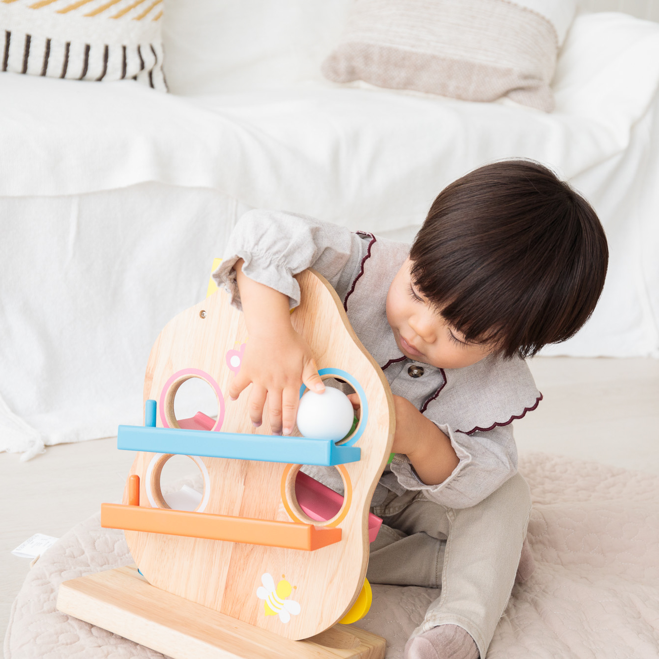 遊びの楽しさと安心への配慮が詰まったこちらのおもちゃは、お子さまが夢中になって遊べるのはもちろん、成長に寄り添いながら長くお使いいただけます。 誤飲の心配にも配慮した設計のため、はじめてのおもちゃとしても安心。 出産祝いやお誕生日など、大切な節目に贈るギフトとしてもおすすめです。