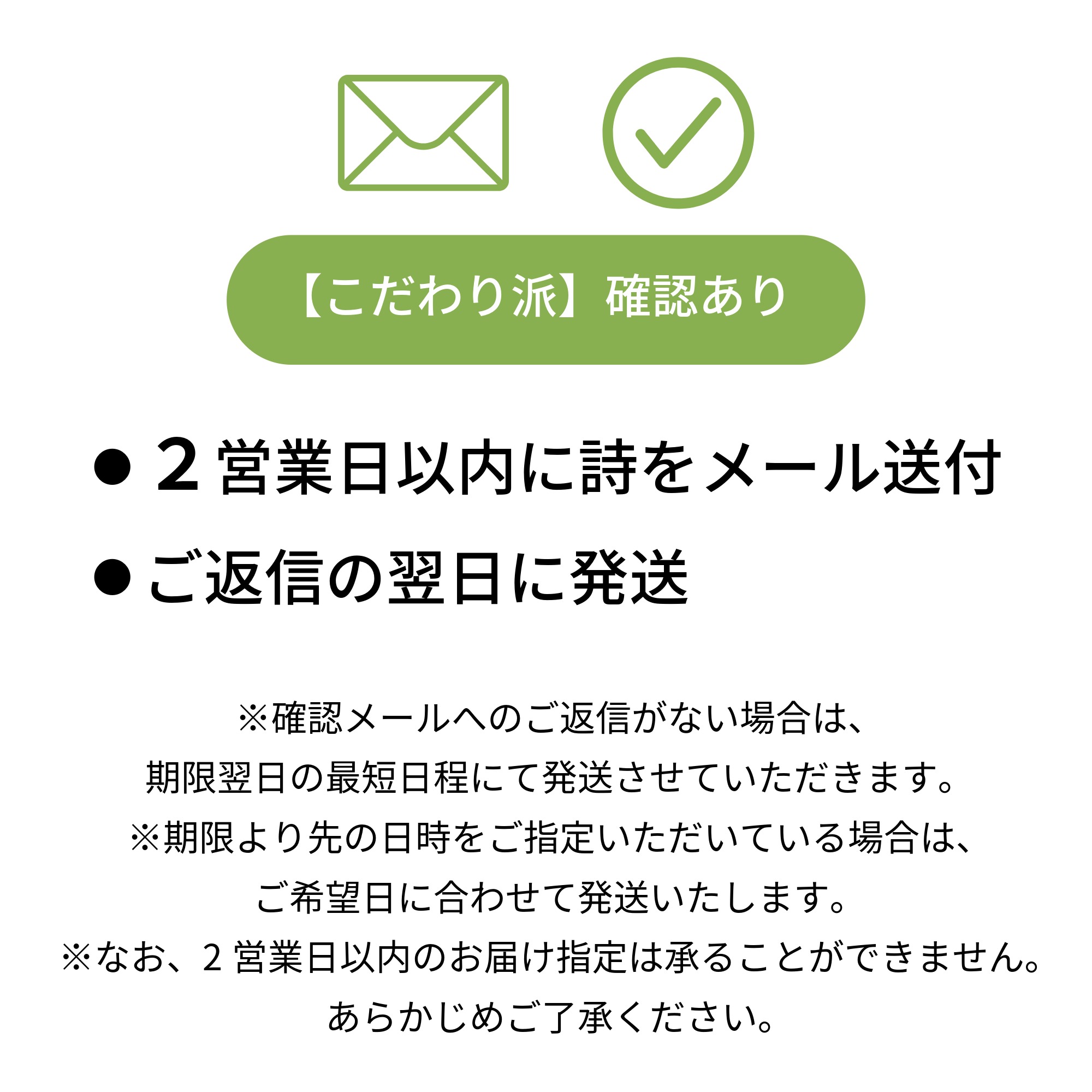 発送前に、メールにて詩の内容をご確認いただけるプランです。 ⚫︎こんな方に: 詩の内容を事前にチェックしたい方、じっくり納得して贈りたい方。 ⚫︎流れ: 1.ご注文後、2営業日以内に詩の内容をメールでお送りします。 2.内容をご確認いただき、メールに記載の期限日以内にご返信をお願いします。 3.ご返信をいただいた翌日に発送いたします。 ※ご返信・または返信期限より先の日程をご指定いただいている場合は、ご希望日に合わせて発送いたします。 ⚫︎ご注意事項: 早めにご返信をいただくほど、早くお届けが可能です。 確認メールへのご返信がない場合は、期限翌日の最短日程にて発送させていただきます。