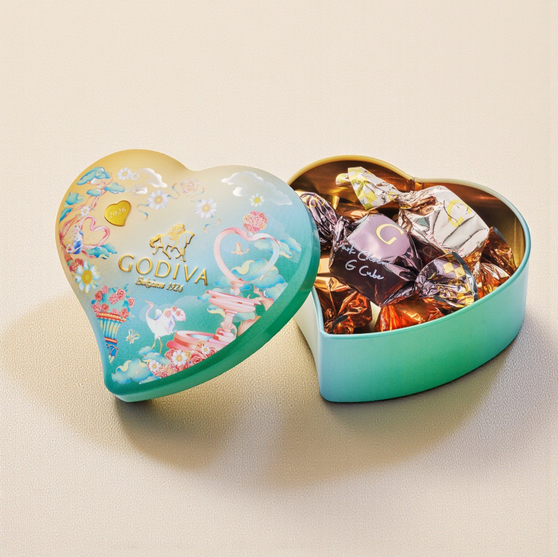 大口注文・法人のお問い合わせはこちらやわらかなグラデーションの空を背景に、優雅に咲き誇る花々と小鳥やうさぎ。 幻想的なデザインのハート形の缶にホワイトチョコレートプラリネ、ミルク、ダーク、2026年バレンタインより新登場のストラッチアテーラのG キューブ チョコレートを詰め合わせました。