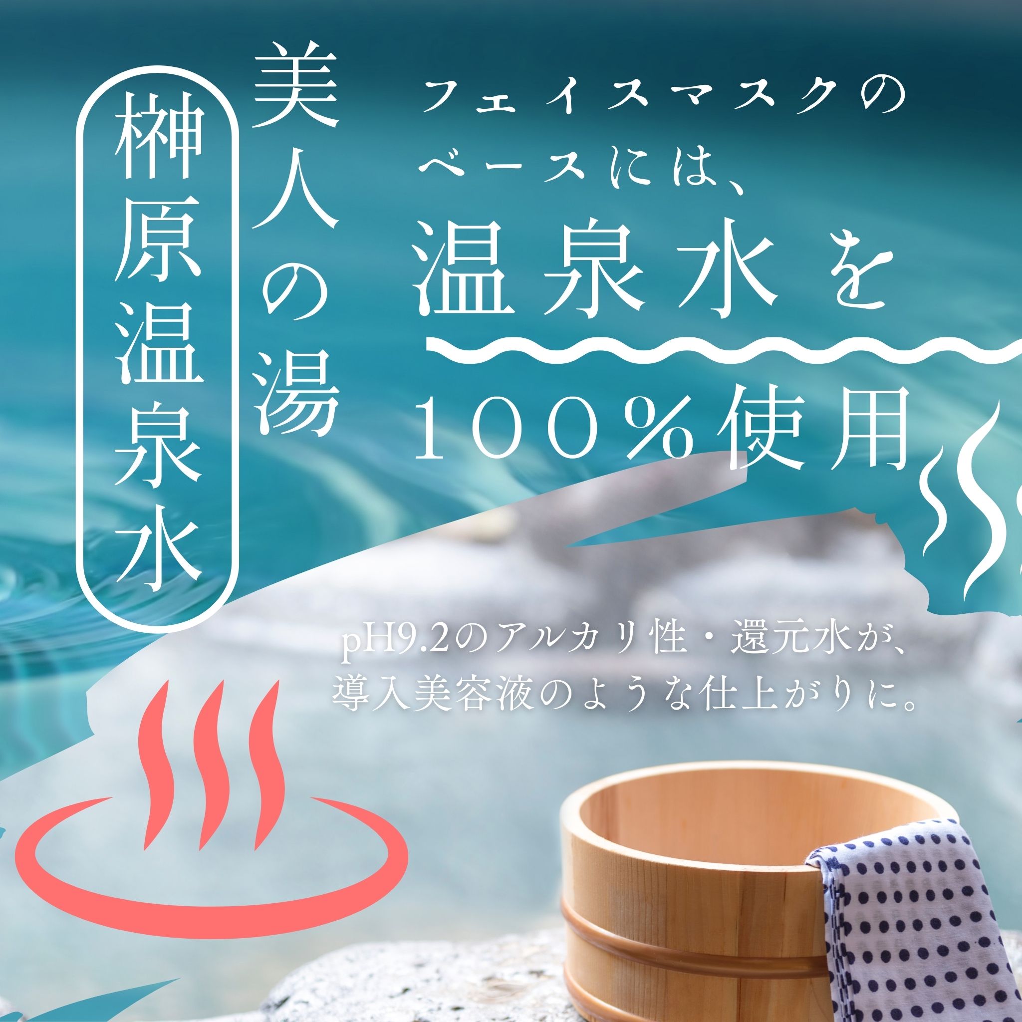 榊原温泉水をベースに、ヒアルロン酸・コラーゲン・エラスチンなどの保湿成分を贅沢に配合。 さらにプラセンタエキスや植物由来エキスが肌をやさしく整え、くすみを払って透明感を引き出します。 乾燥しがちな肌を包み込み、しっとりとなめらかな質感へ。 毎日のスキンケアに、明るく澄んだ印象を叶える特別な一枚です。