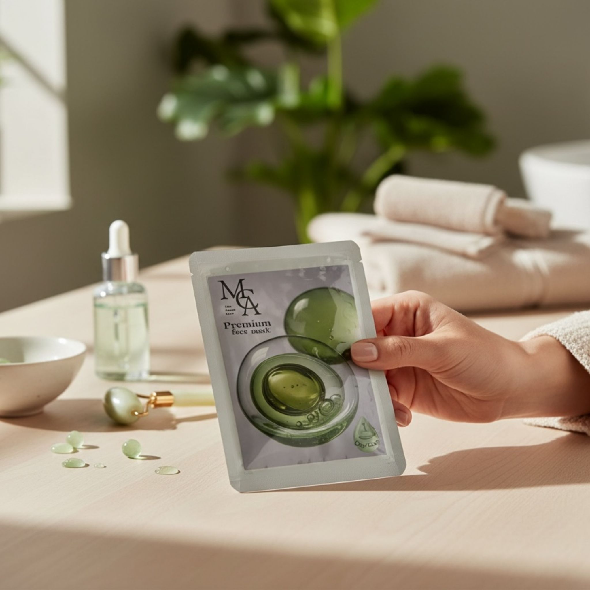温泉水をベースにマコモ葉エキスと香りに国産紫蘇の精油を使用した、特別な日のための集中ケア一枚入りです。