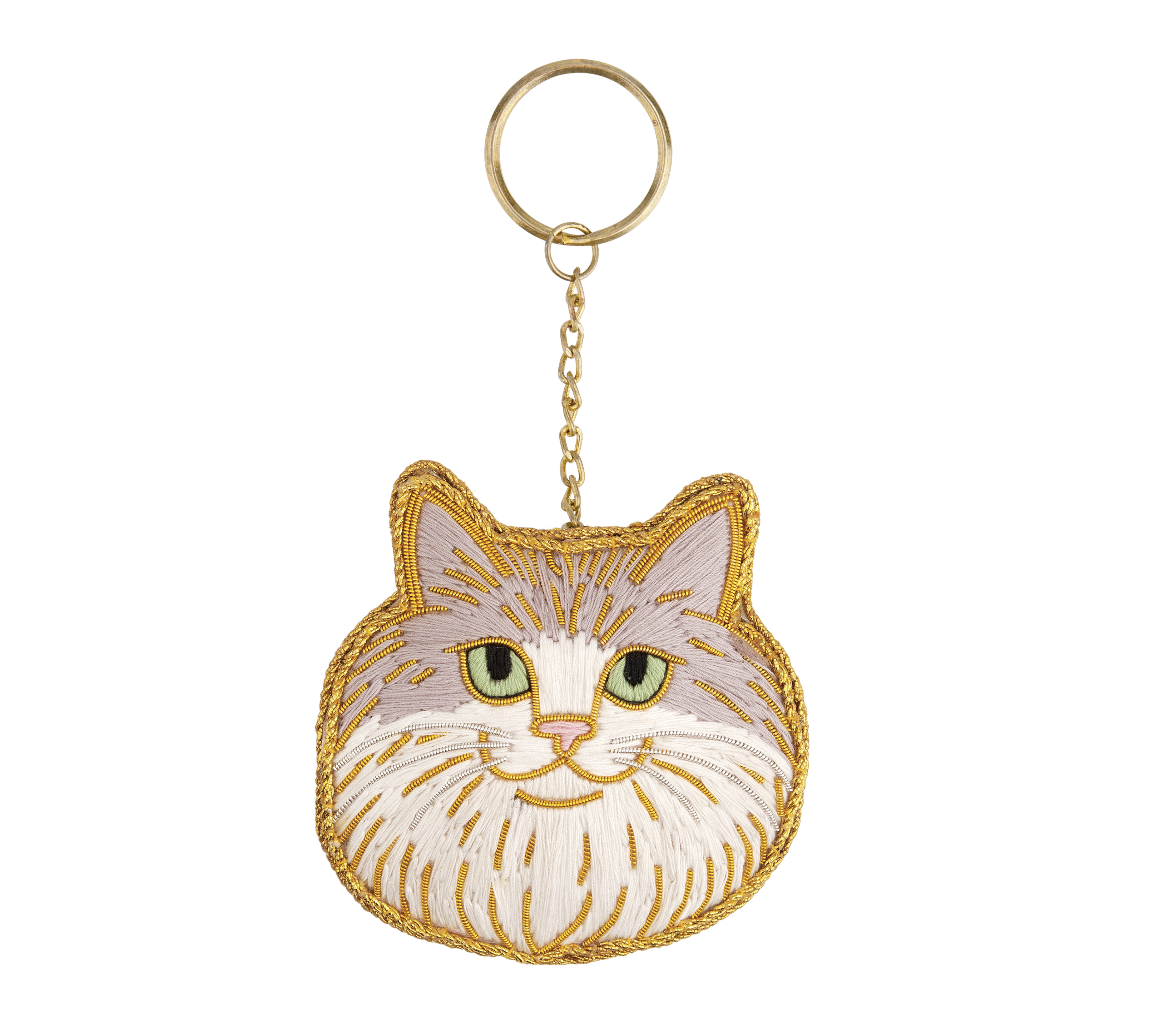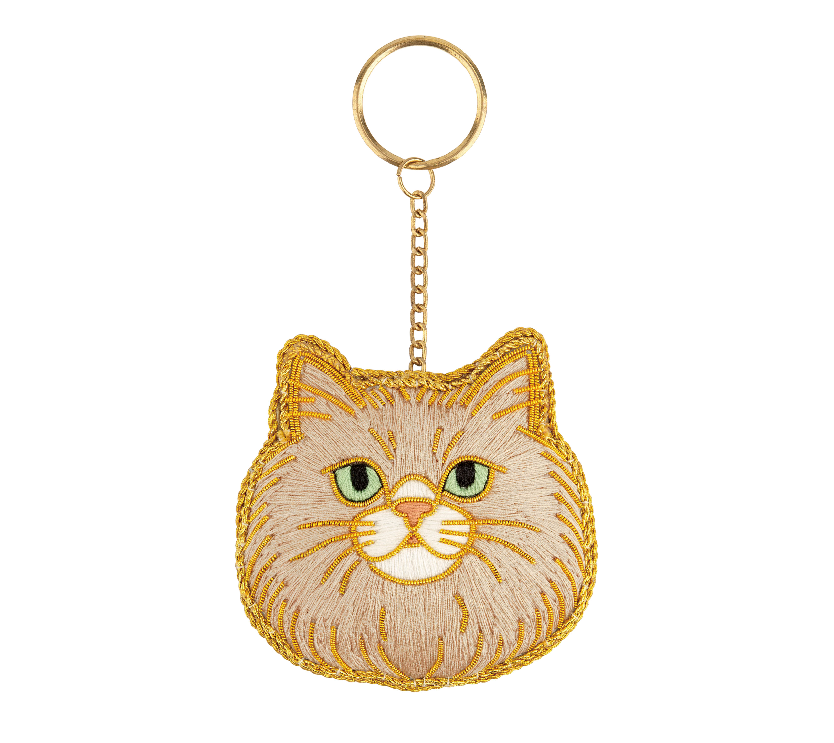 ザリ刺繍で丁寧に仕上げた、猫の顔が主役のキーリング。