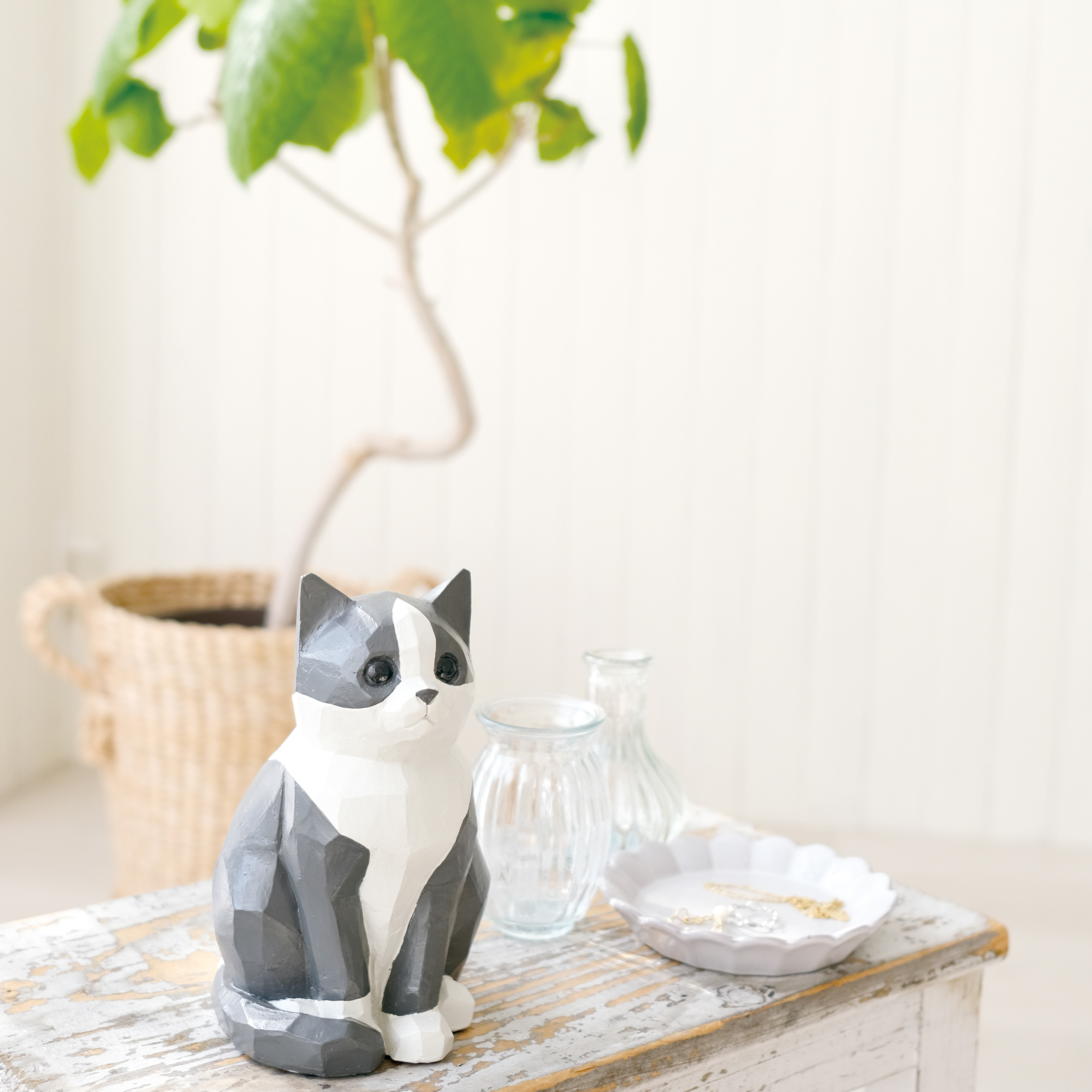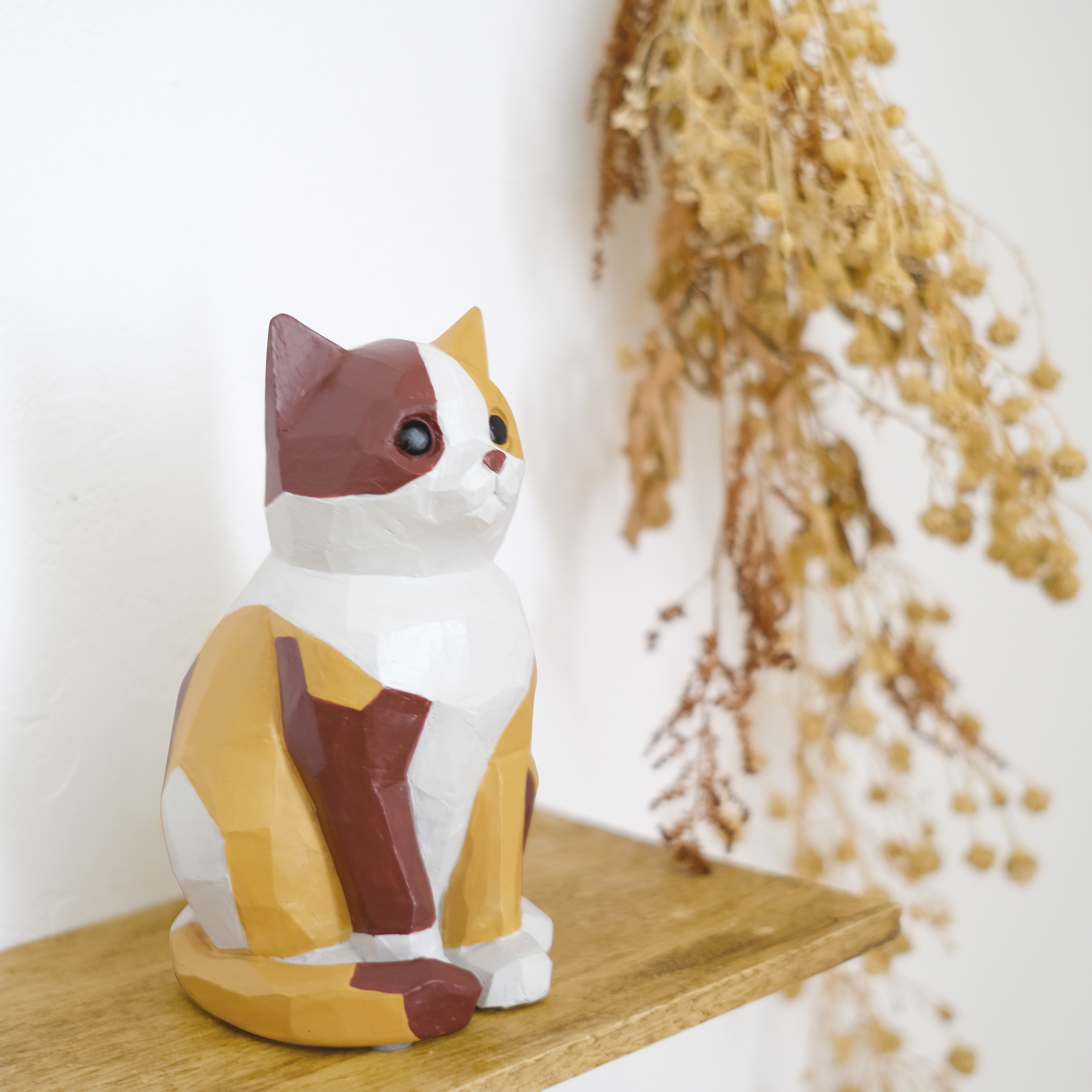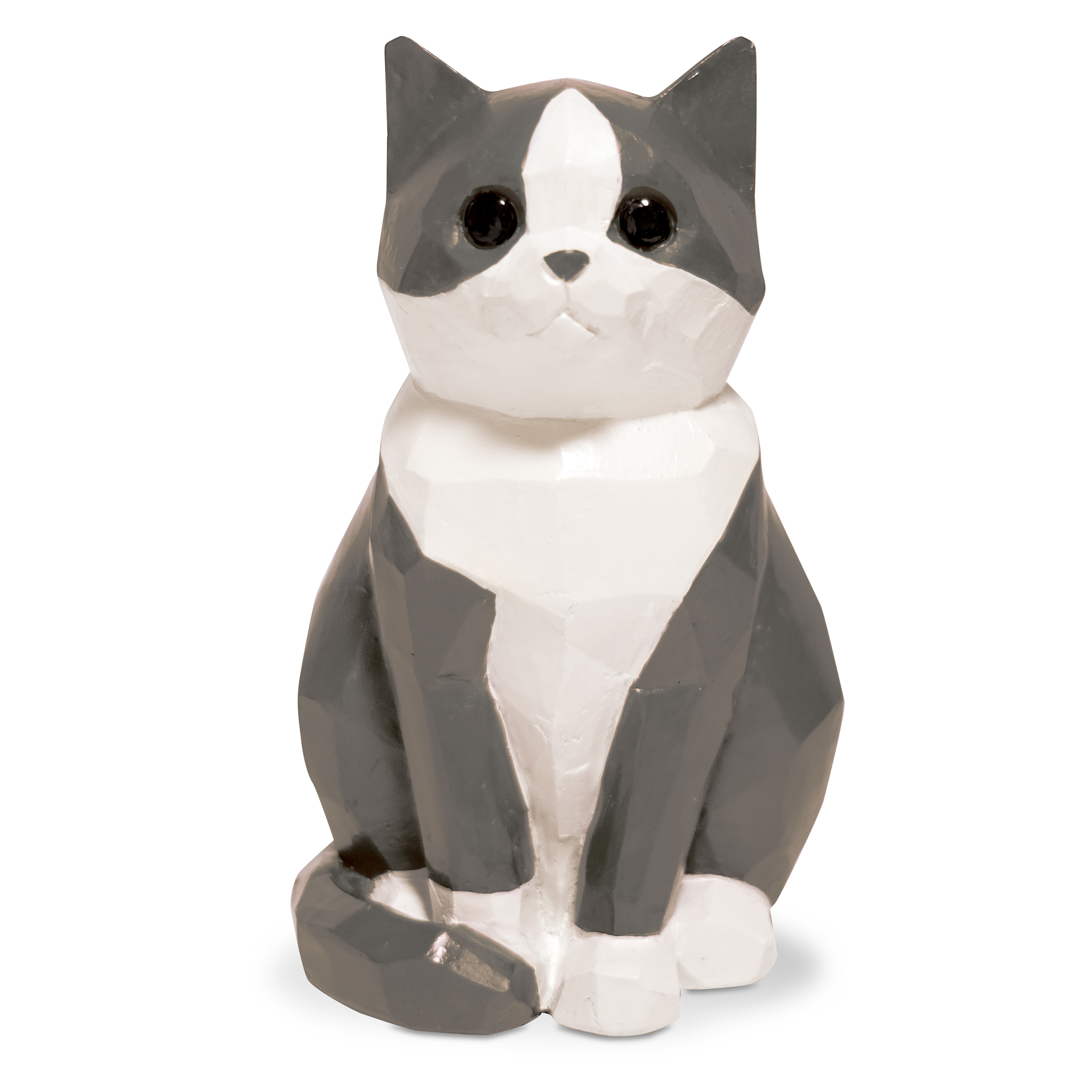大口注文・法人のお問い合わせはこちらデスクの片隅で、窓辺の光を浴びながら。 温かいフォルムの猫があなたをじっと見つめています。 モダンなポリゴンデザインでありながら、その表情は驚くほど愛らしい。