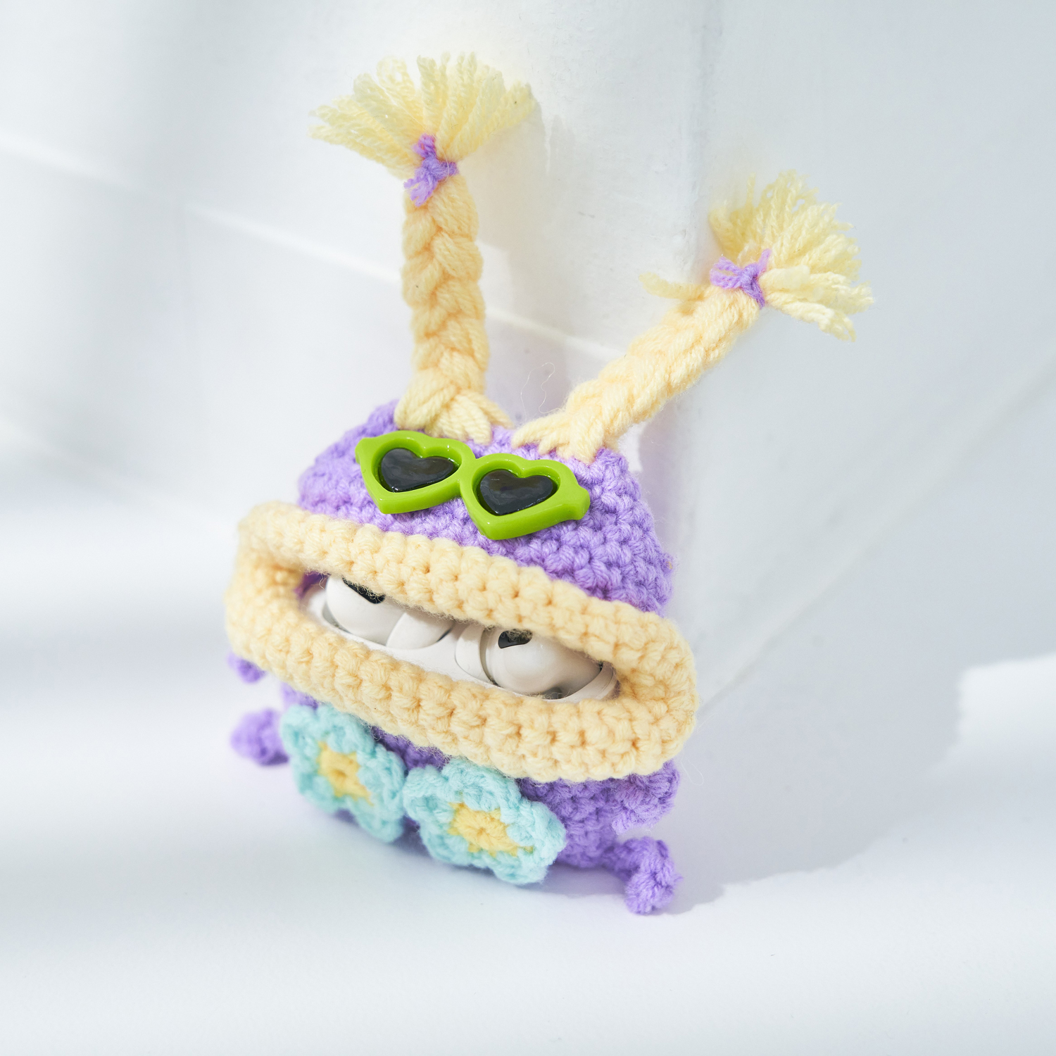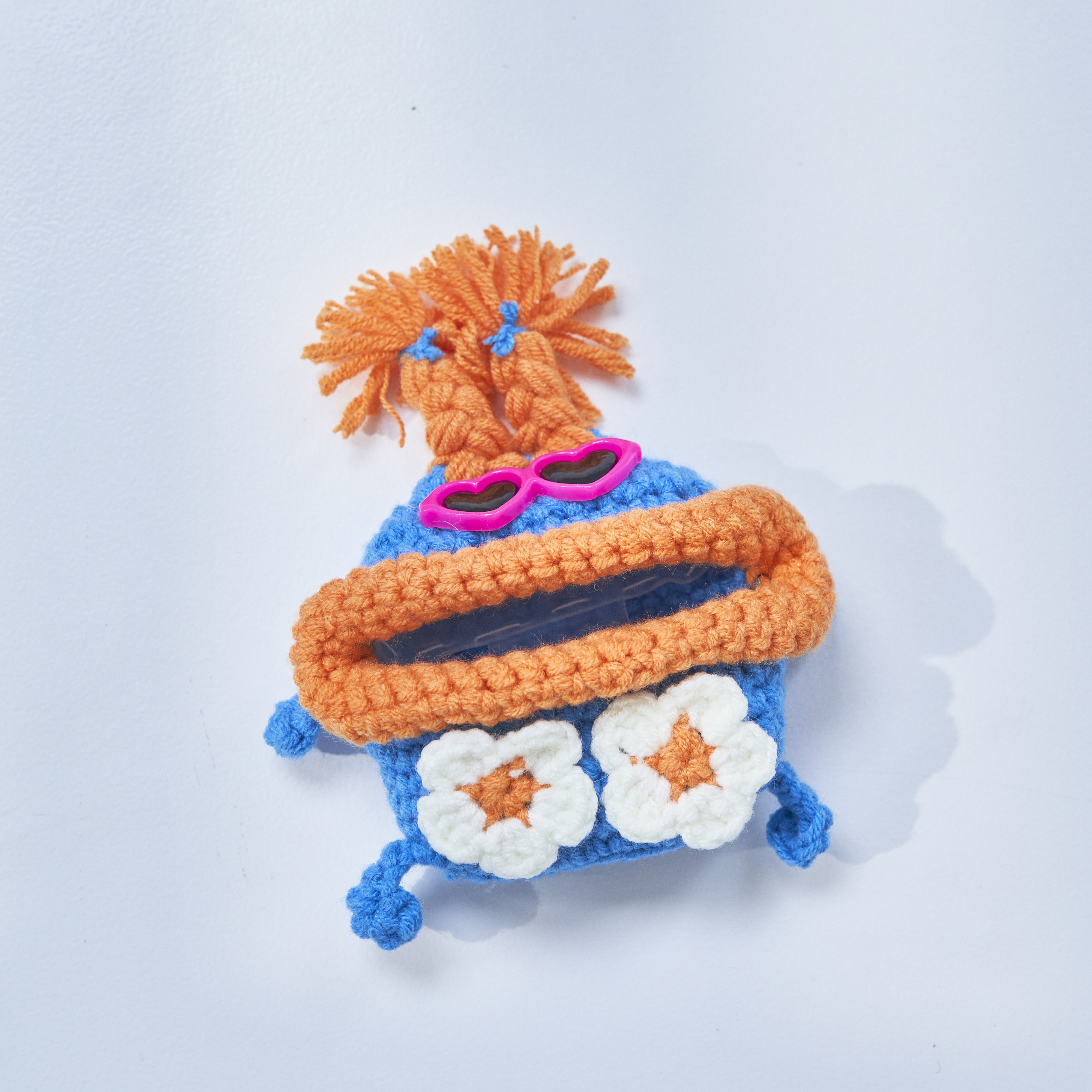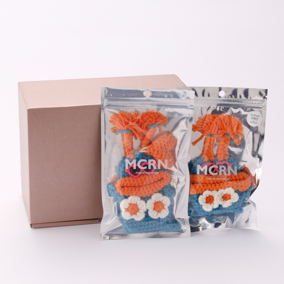 「macaroni edge(マカロニエッジ)」のキュートな毛糸のマスコットキーケースと大きなお口の中でAirPodsを守ってくれるケースのセット。ひとつひとつ手編みでつくられた表情が可愛いらしいデザインです。誕生日やお祝いの贈り物におすすめです。