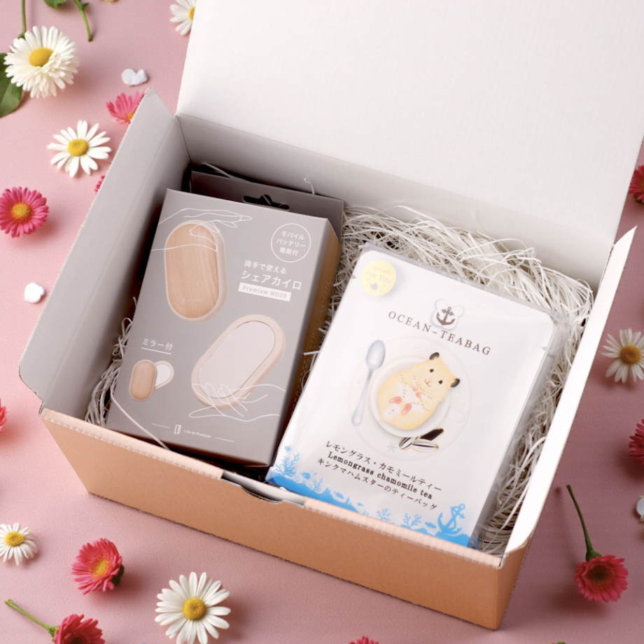 大口注文・法人のお問い合わせはこちらナチュラルな木目調が心地いい充電式カイロと、アニマル柄のパッケージが可愛い紅茶のセット。 手元をじんわり温めるカイロと、心まで和むティータイムを一緒にお届けします。 お部屋の中でもお出かけ先でも、ホッと落ち着く時間を贈れる癒やしのギフトです。