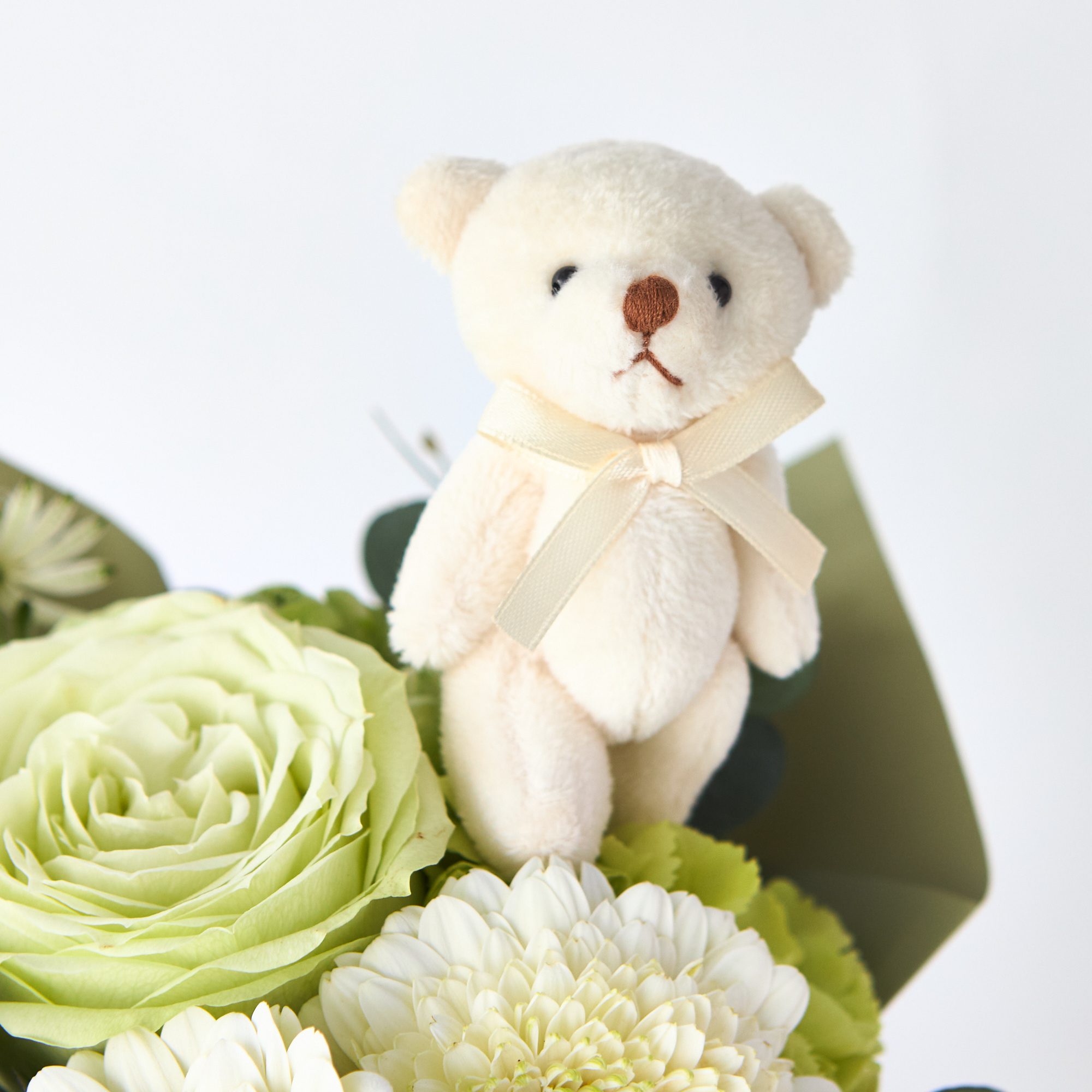 有料オプションにて、ブーケにクマのピックをお付けいたします。 愛らしいデザインは、ご出産やご結婚などのギフトにもぴったりです。 ※イメージ画像のため実際にお届けするお花と異なります。